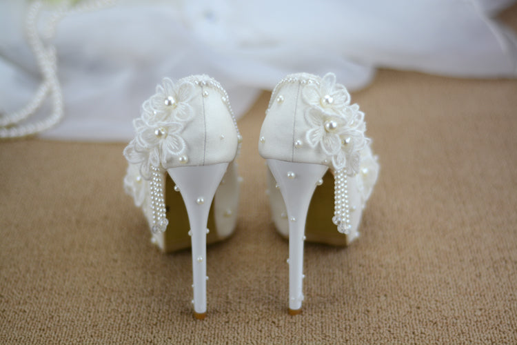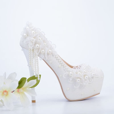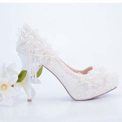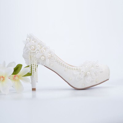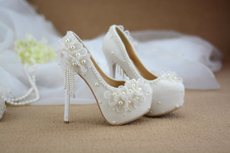 Bridesmaid shoes wedding dress lace white sweet flower tassel female womens shoes 6cm 8cm 11cm 14cm high heel Big size 43