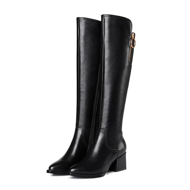British style cowhide material zippered decorative boots pointed thick high heel side zipper rubber soles winter boots women