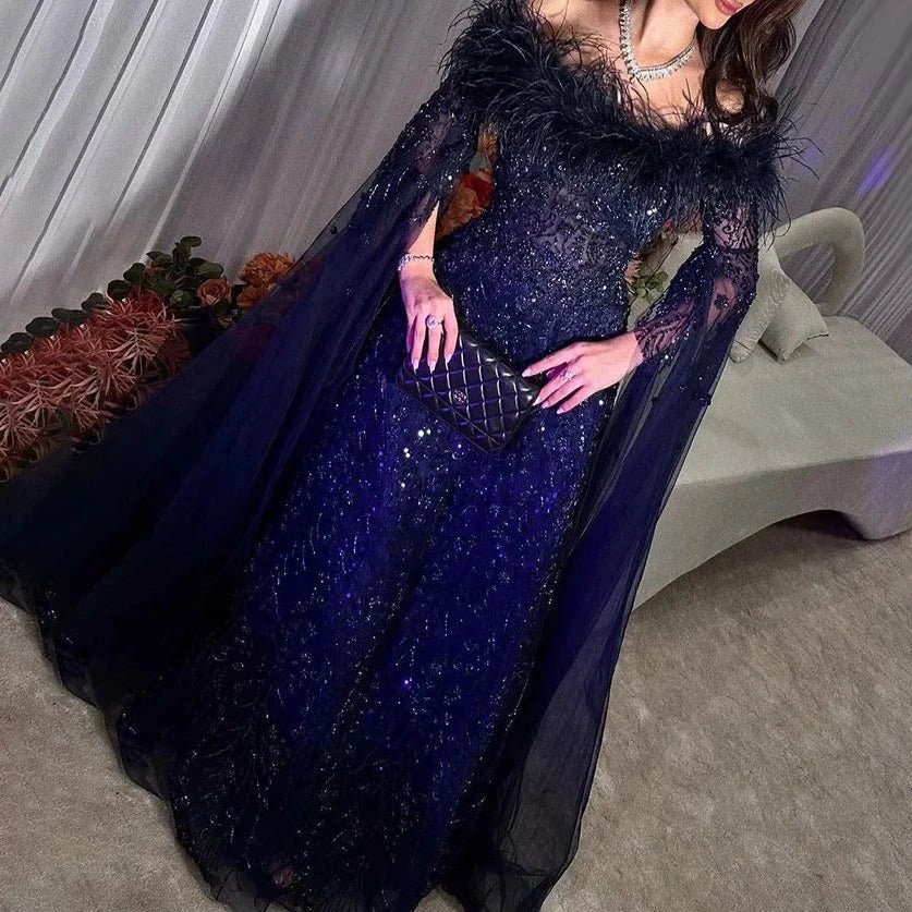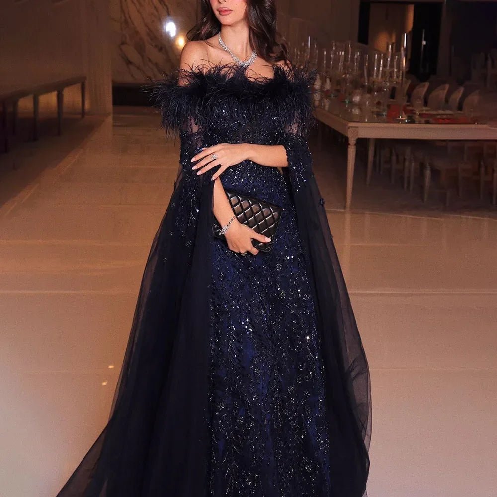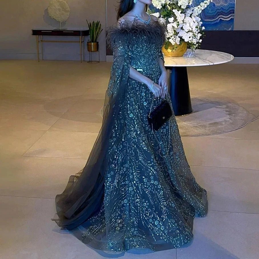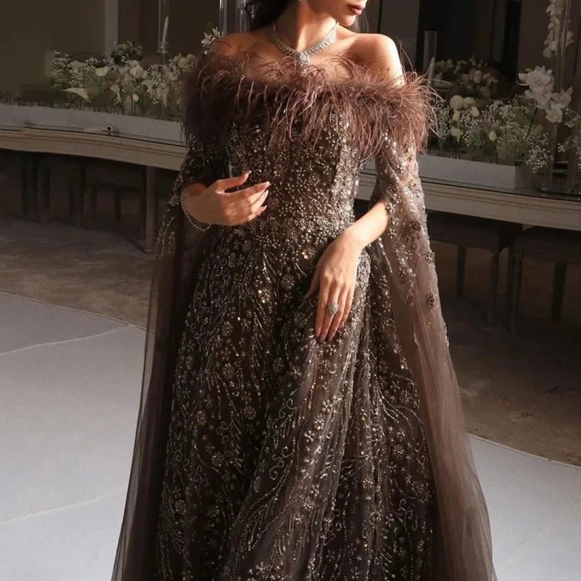 Brown Feathers Beaded A Line Evening Dress Off Shoulder Cape Sleeve Gown