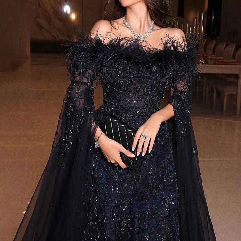 Indulge in luxury with our Brown Feathers Beaded A-Line Evening Dress. The intricate beadwork and feather detailing add a touch of elegance to this off-shoulder gown. The cape sleeves add a unique and stylish flair to your evening look. Perfect for formal events and special occasions.