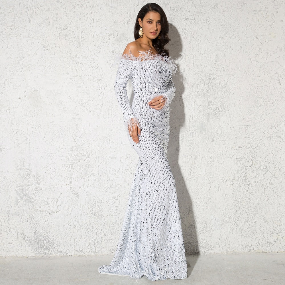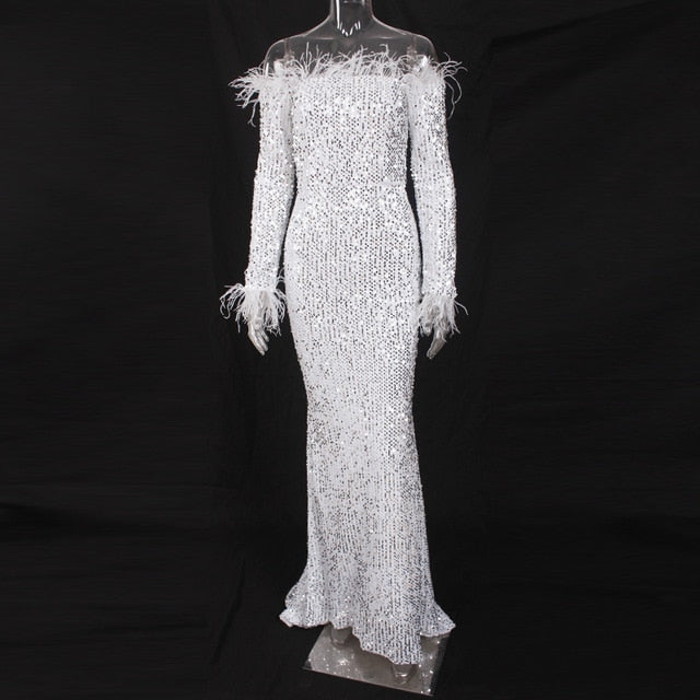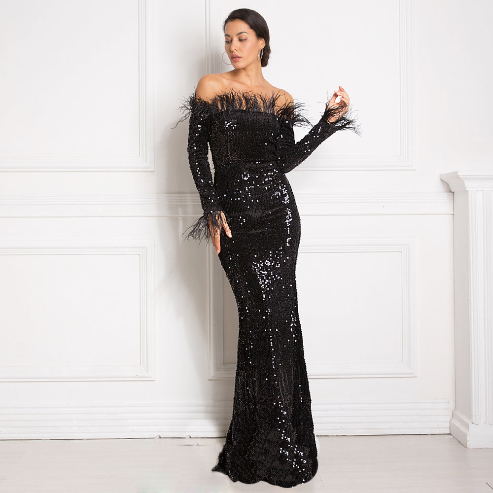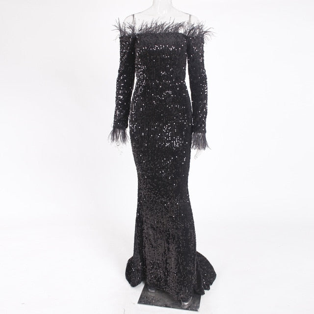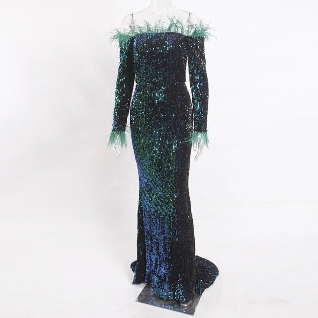Burgundy Shiny Sequin Feather Velvet Party Dress Long Sleeve Bodycon Stretchy Slash Neck Floor Length Mermaid Dress Black Green