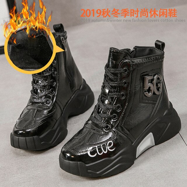 Platform Women Boots 2019 Winter Snow Boots Female Boots Bright Leather Warm Lace Flat with Women Shoes Tide Botas Mujer
