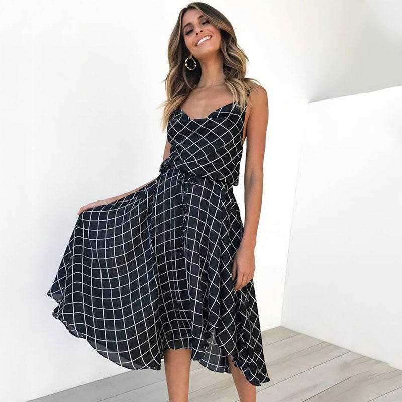 Vintage Women Plaid Dresses Summer Ruffles Strap Irregular Lace Up Dress Sleeveless Dresses for Female Vestidos