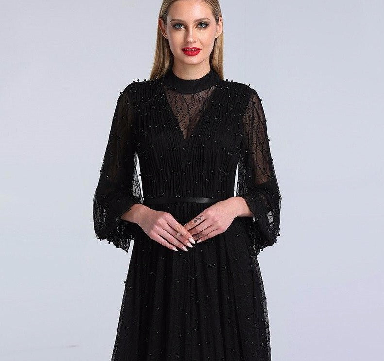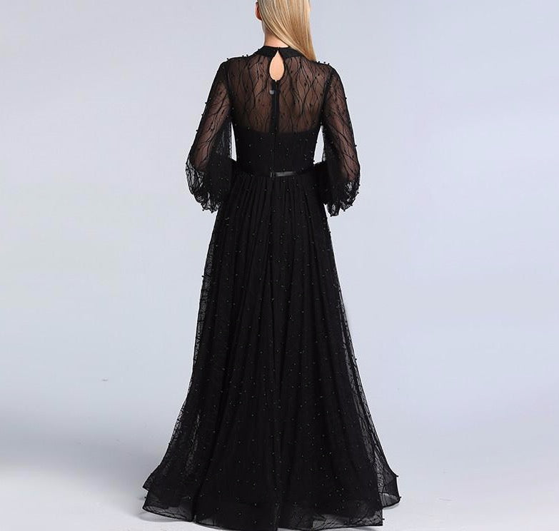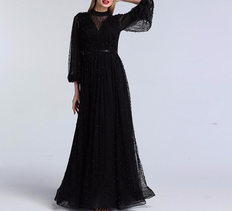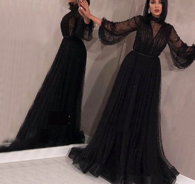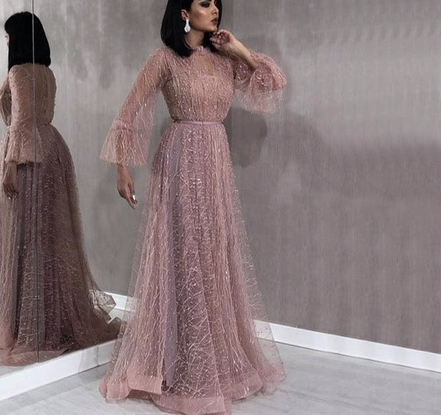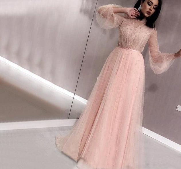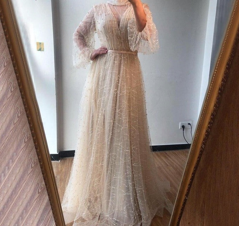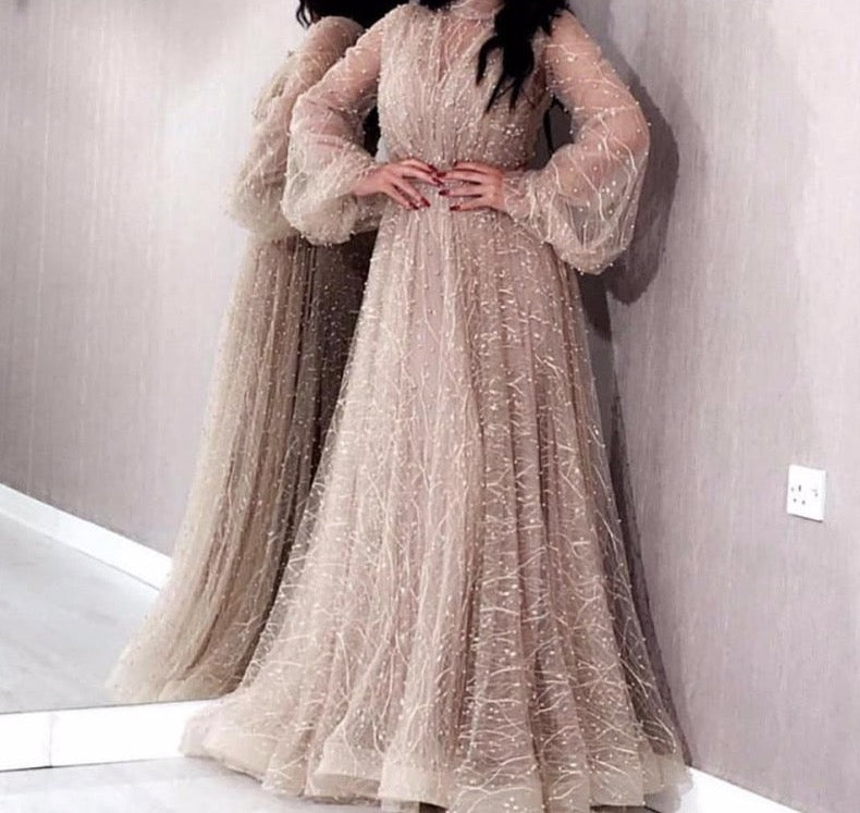 Champange Pearls A-Line Evening Dresses Dubai Long Sleeves Sexy Tulle Evening Gowns