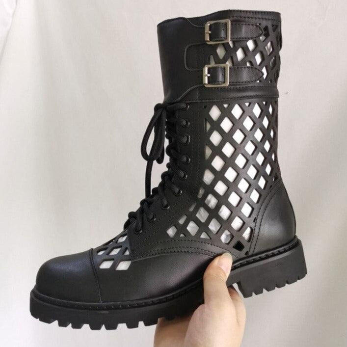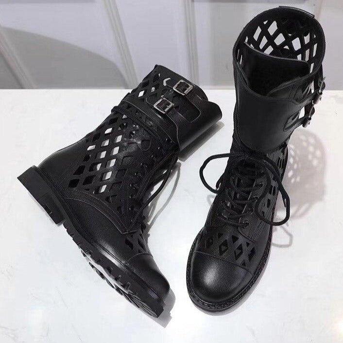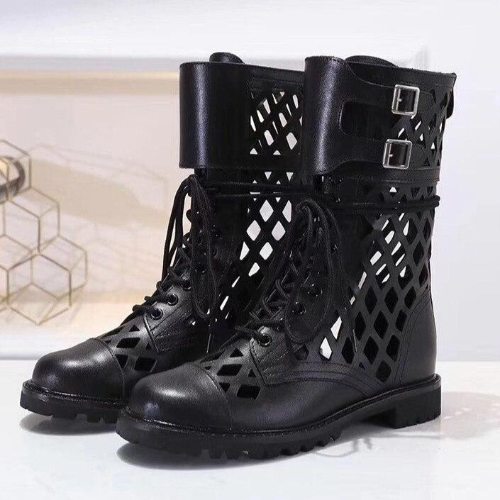 Chic hollowing out style Ankle Boots Women genuine leather runway shoes femme comfy flat heel Chelsea boots cross lace up mujer