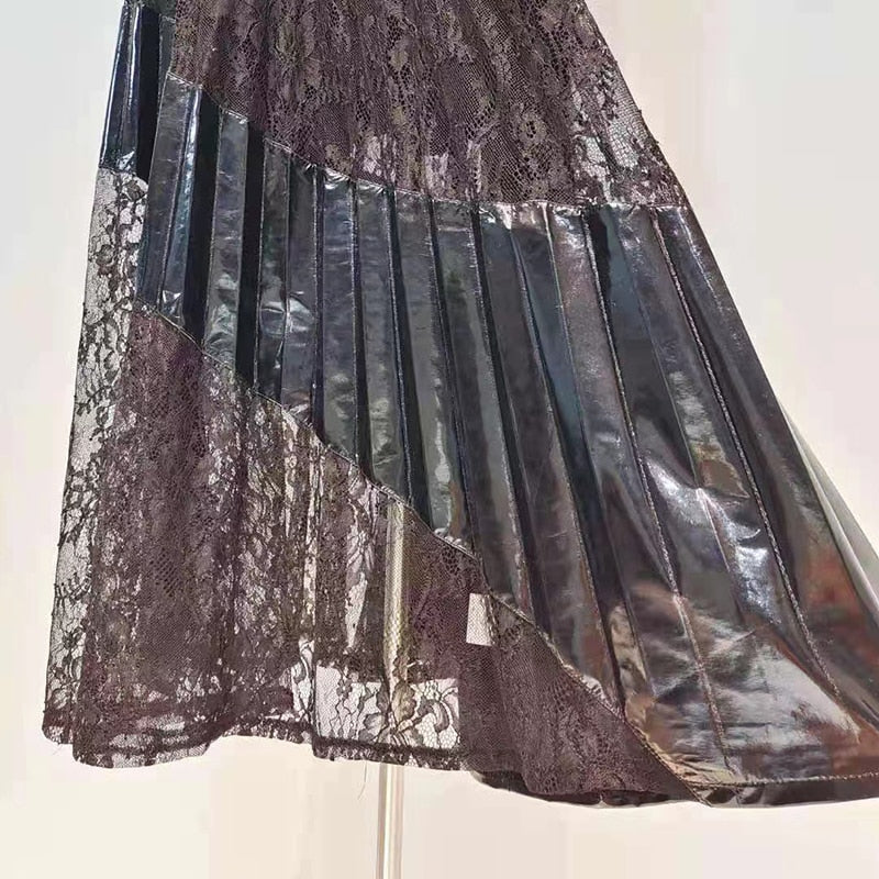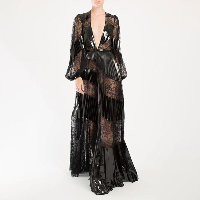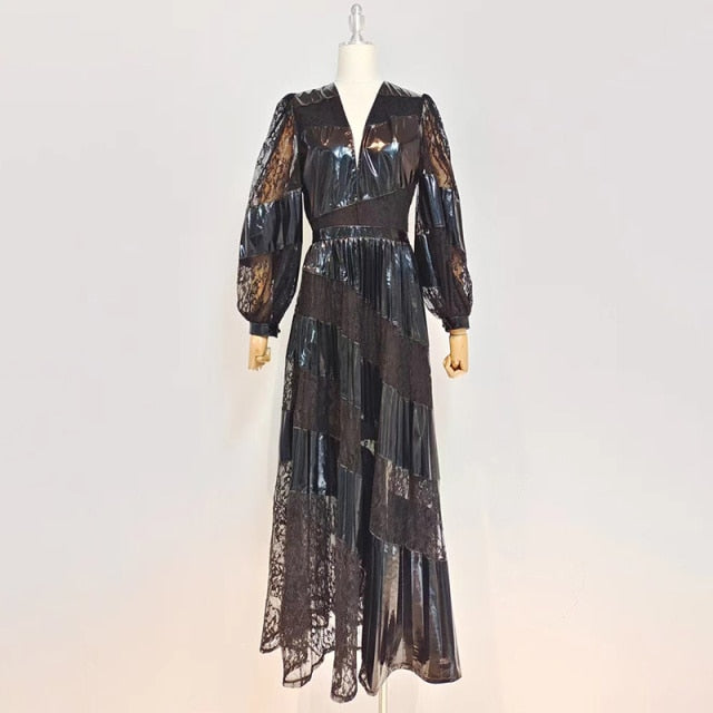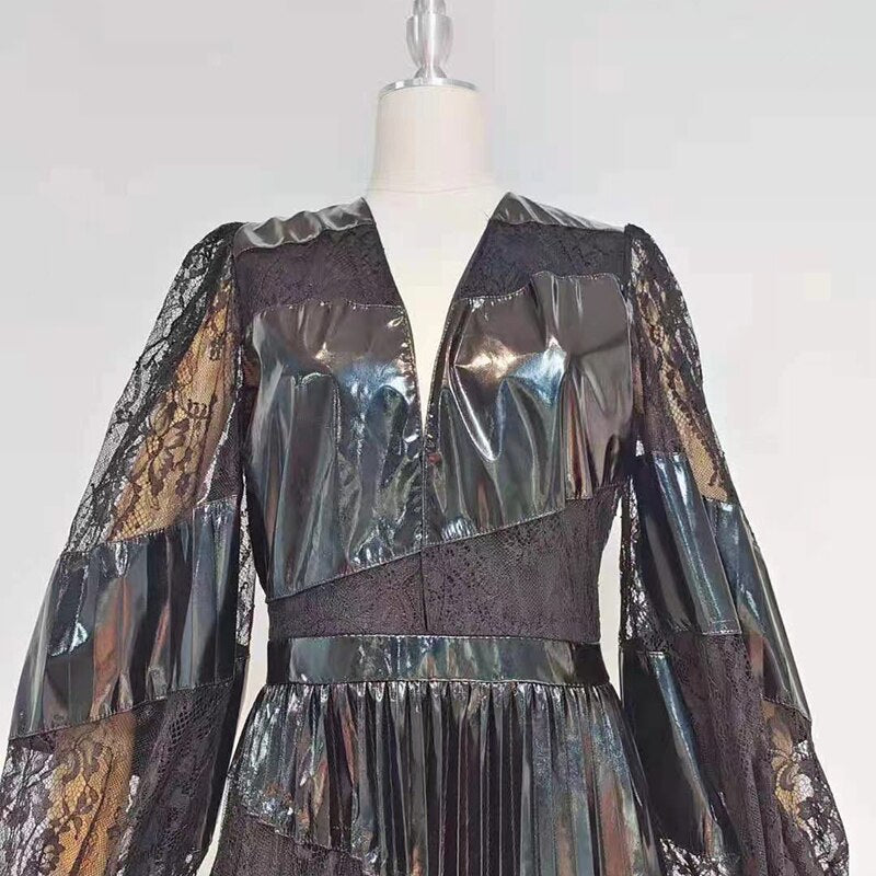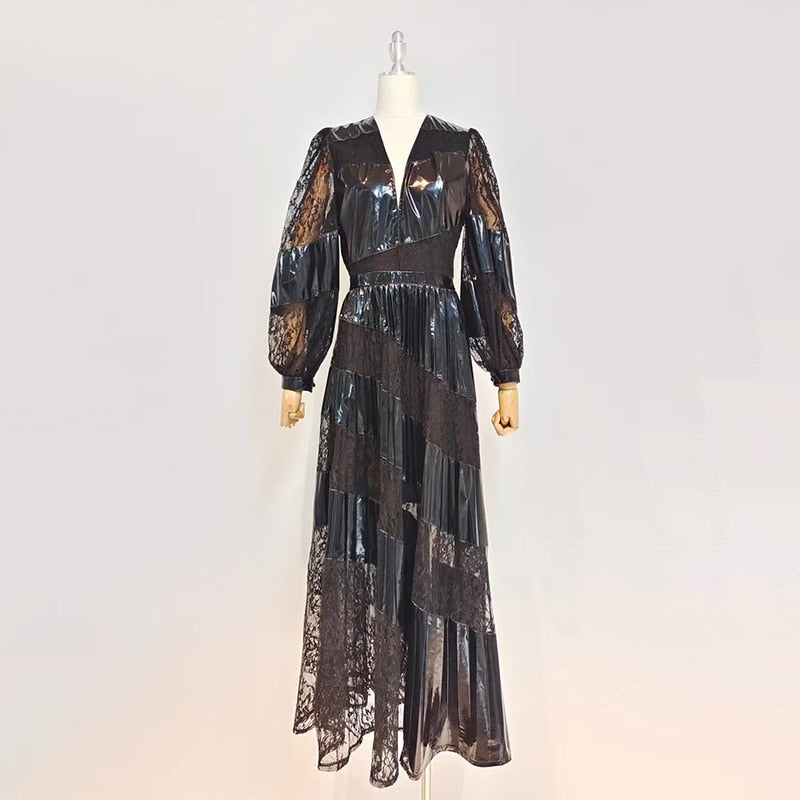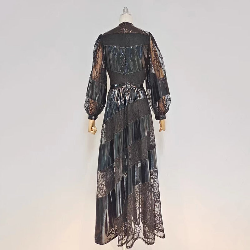 Black Lace Panel Dress For Women V Neck Lantern Sleeve