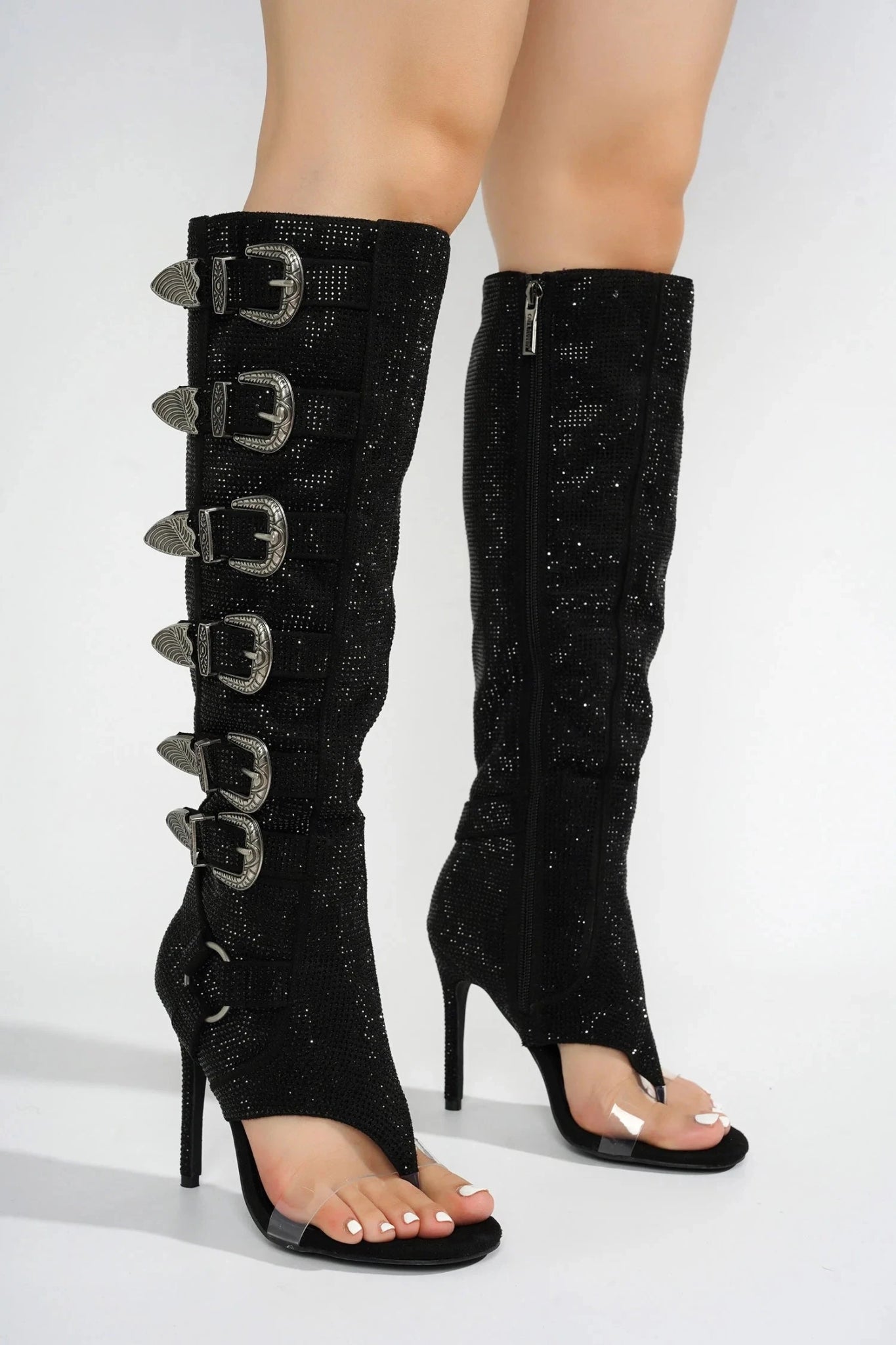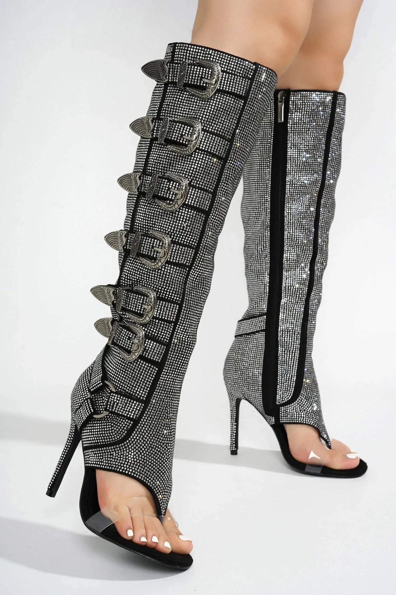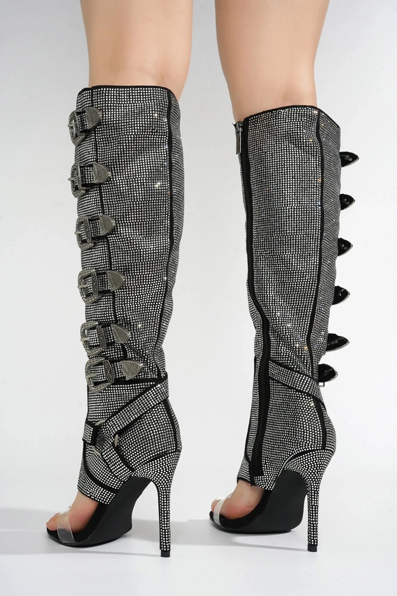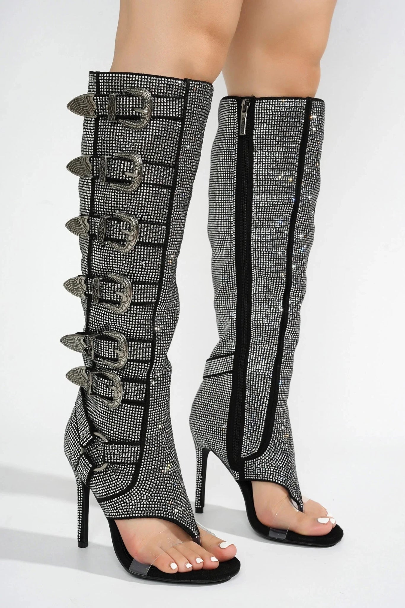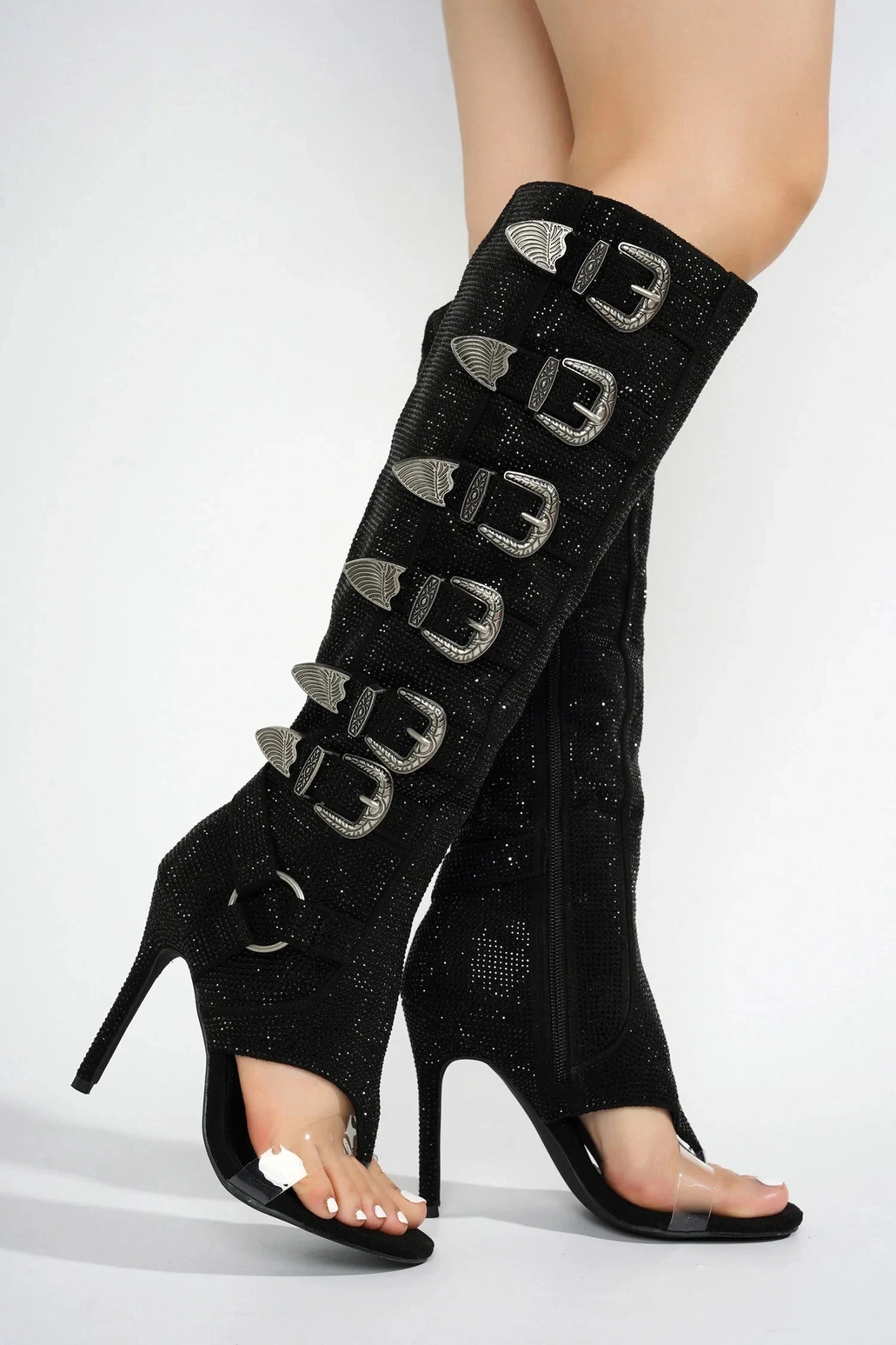Turn heads with these stunning knee-high boots featuring multiple decorative buckle straps and sparkling crystal embellishments. The open-toe design paired with a sleek, high stiletto heel creates a look that is both glamorous and bold. Perfect for those who love to make a dazzling statement.