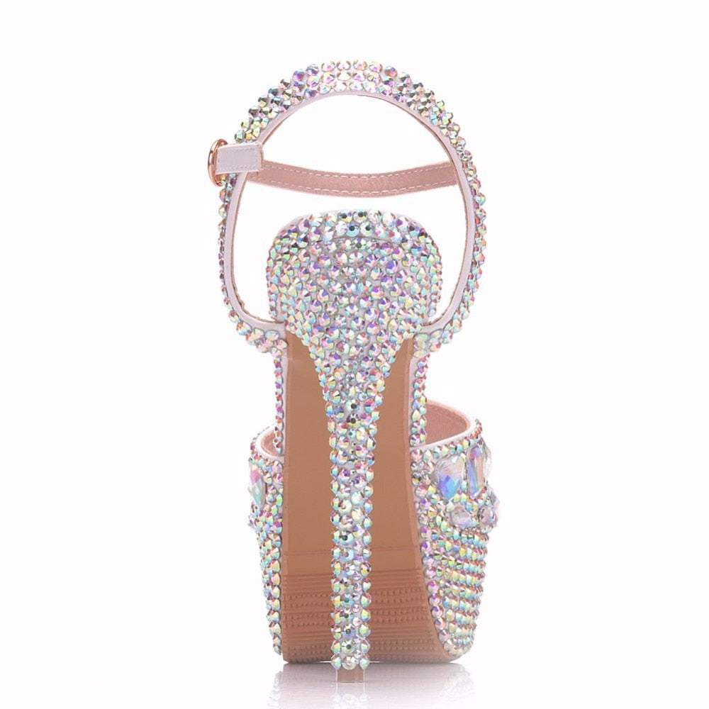 Crystal Queen Diamond Women Super High Heel Wedding Pumps 14cm Peep Shoes Platform 4CM Crystal Wristband Colorful Thin Heels