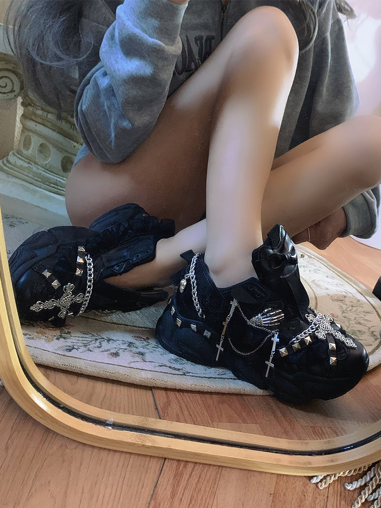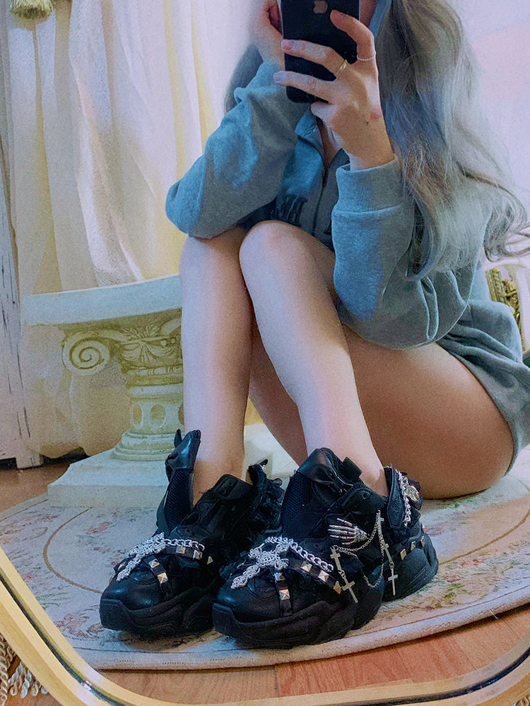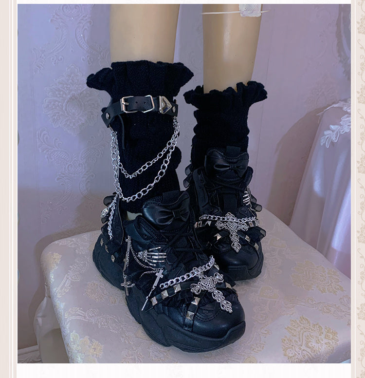 Dark Black Round Toe Lace Metal Chain Cross Old Shoes for Fall/winter New Black Bow Deep Mouth Platform Casual Sneakers