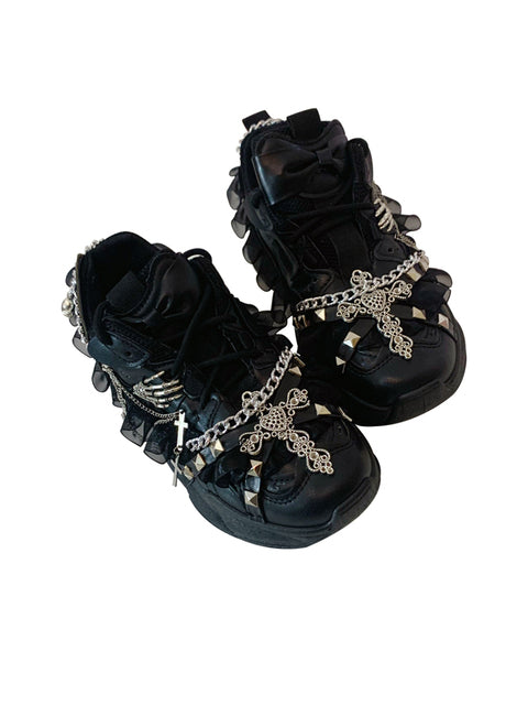 Dark Black Round Toe Lace Metal Chain Cross Old Shoes