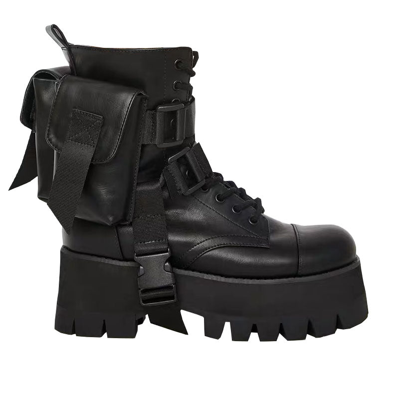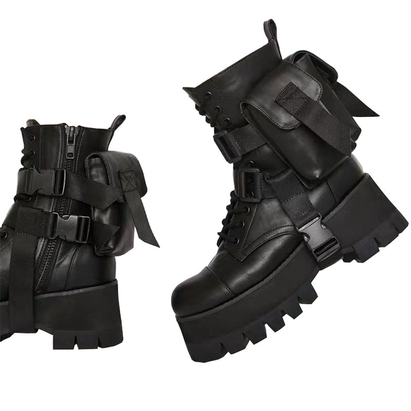 Design 2020 New Arrival Pocket Motorcycle Women's Boots Handsome Lace Up Thick-soled Black Military Shoes Half Boots