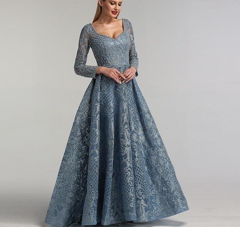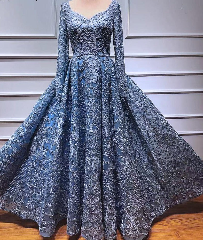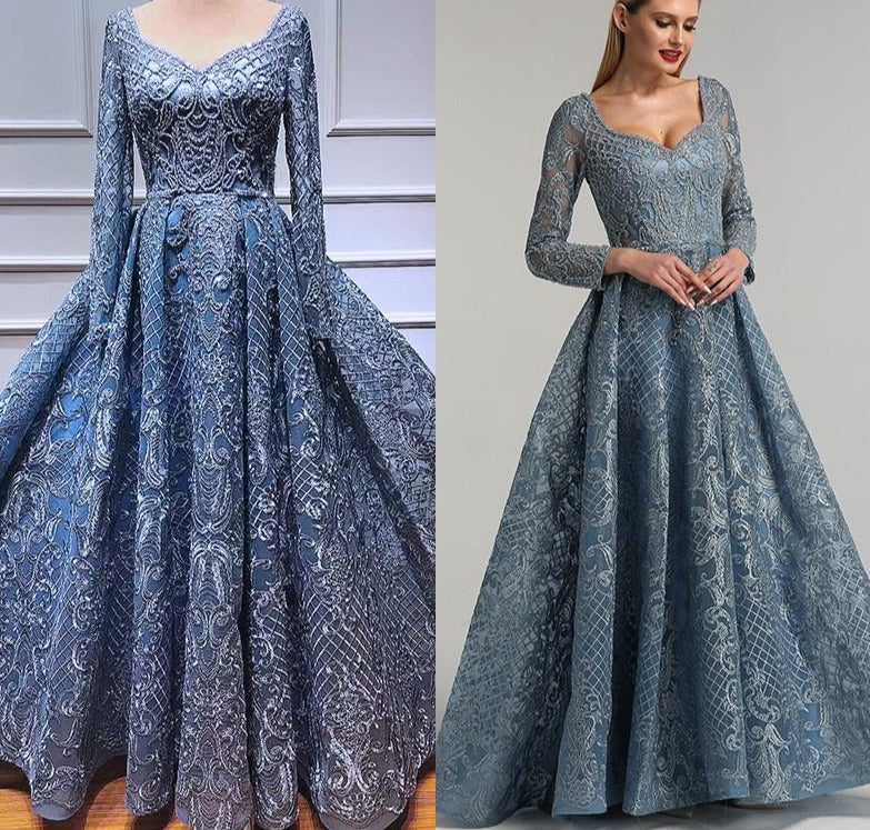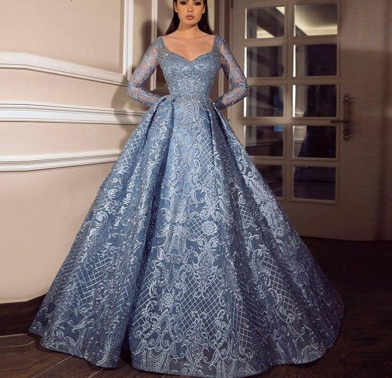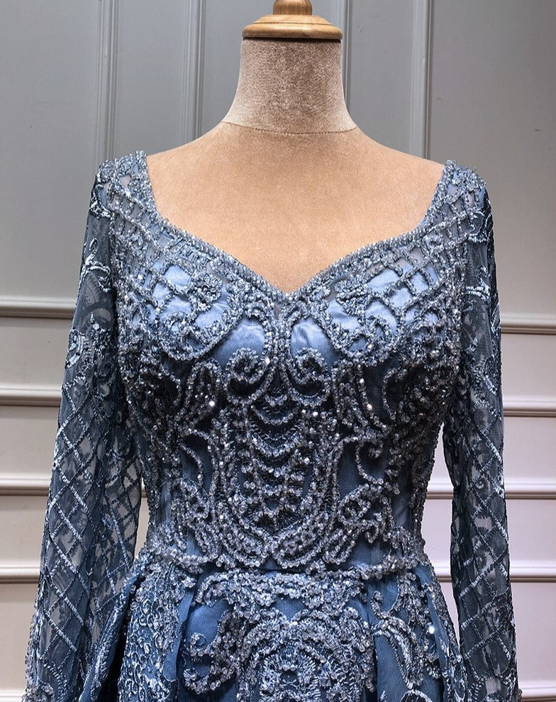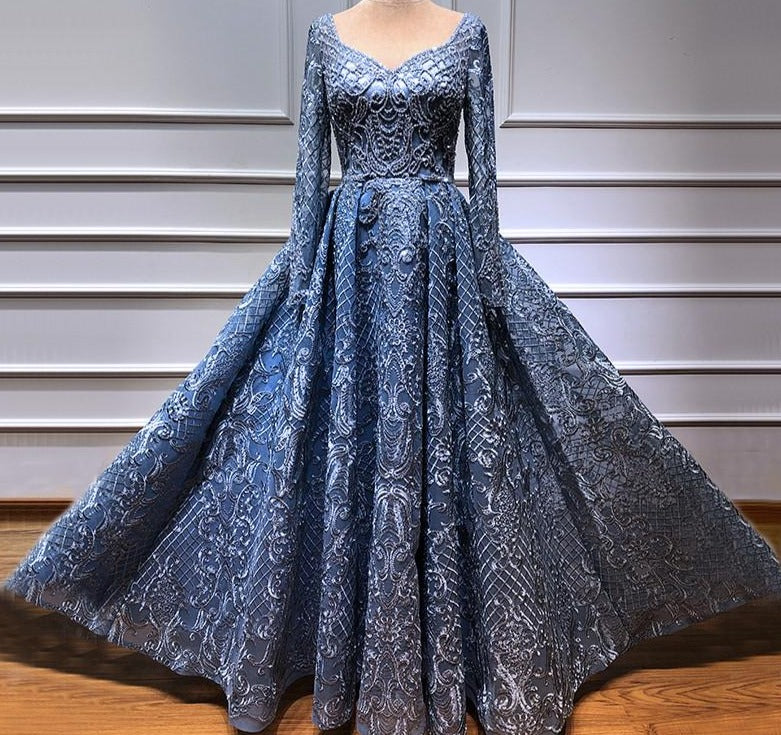 Dubai Blue Luxury Long Sleeves Evening Dresses Lace V-Neck Crystal A-Line Evening Gowns