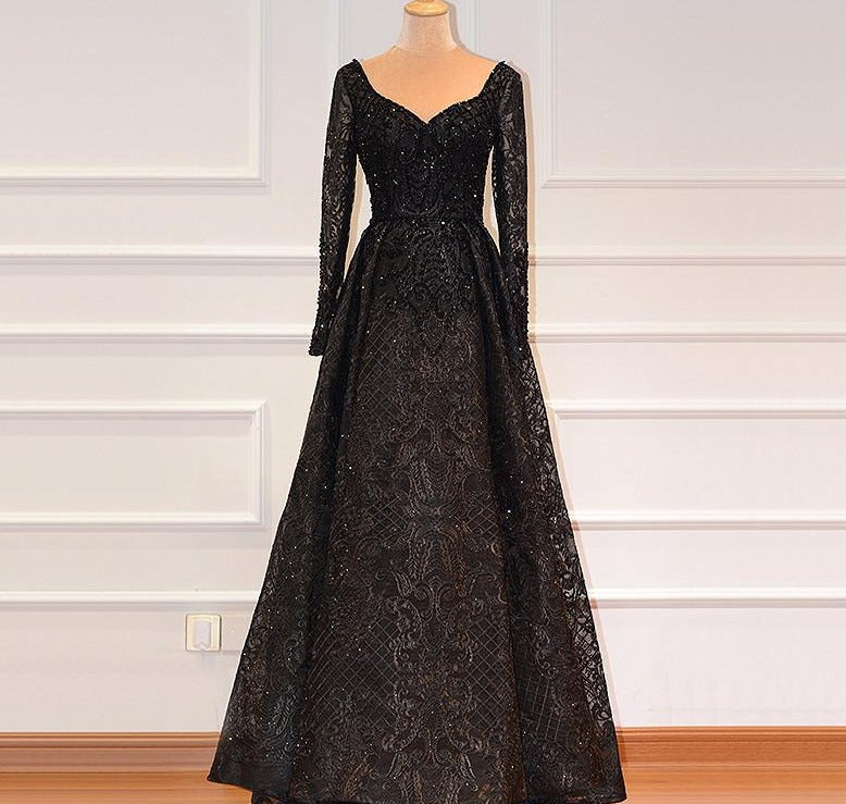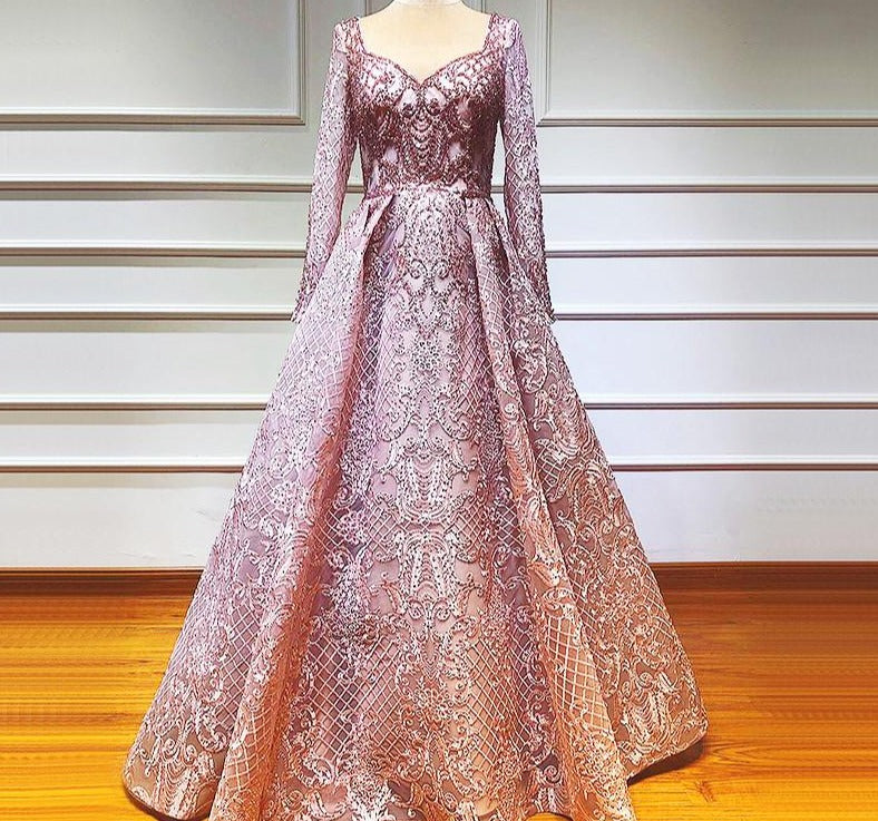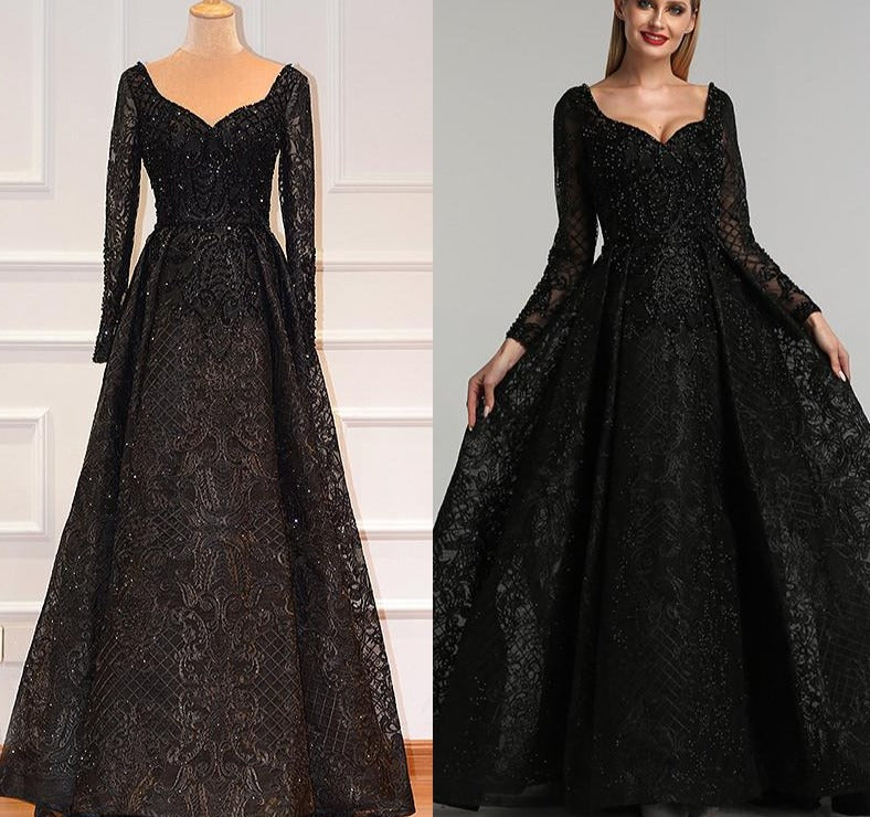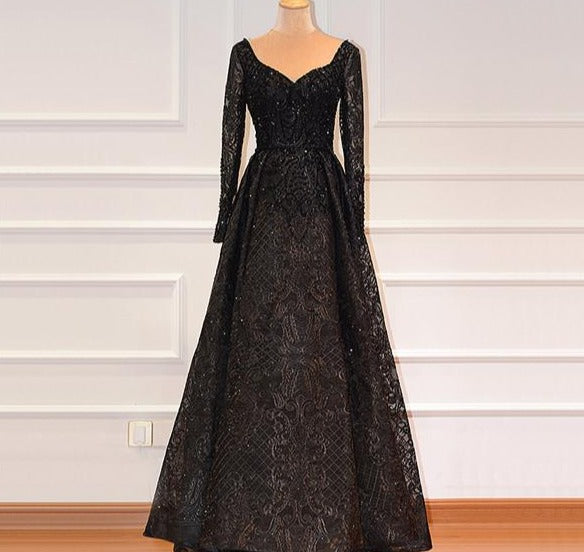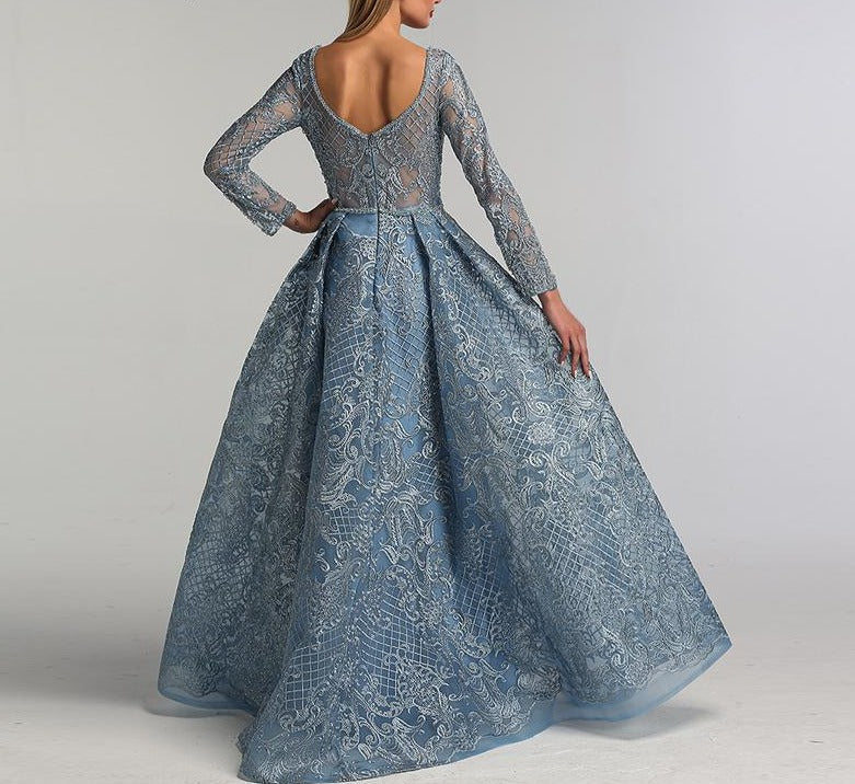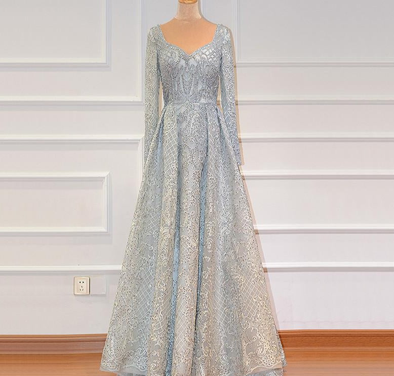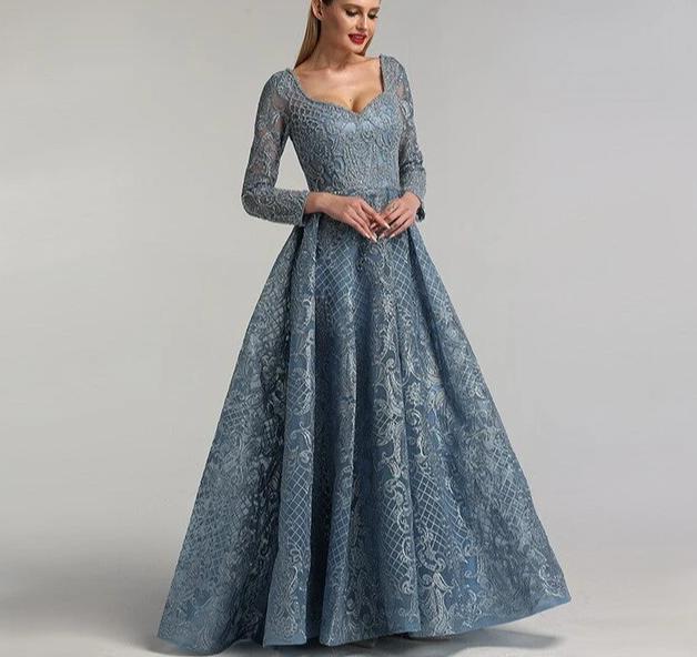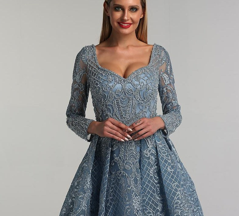 Dubai Blue Luxury Long Sleeves Evening Dresses Lace V-Neck Crystal A-Line Evening Gowns