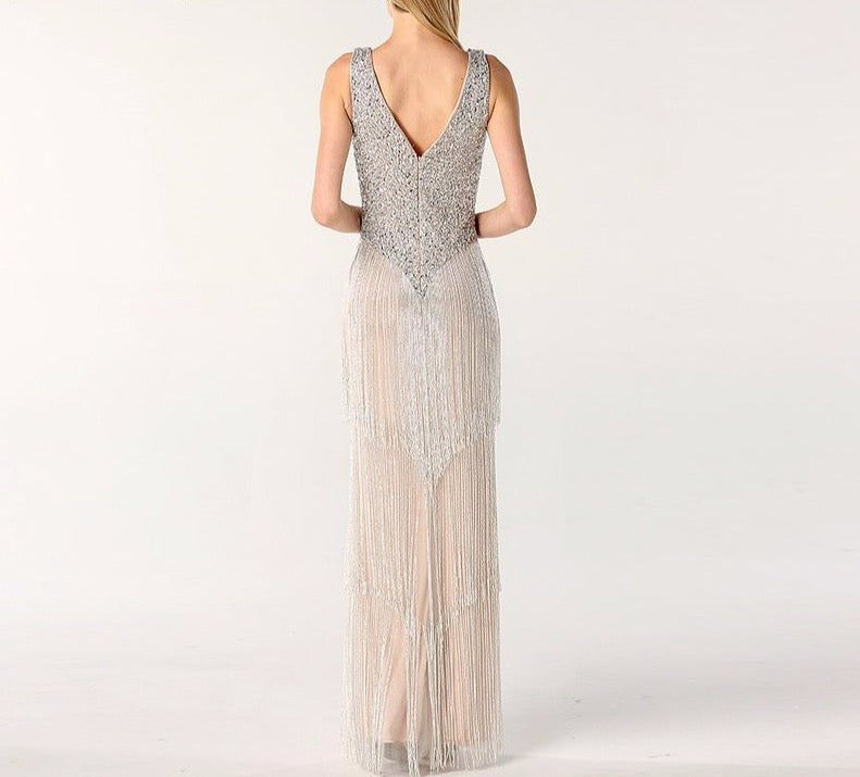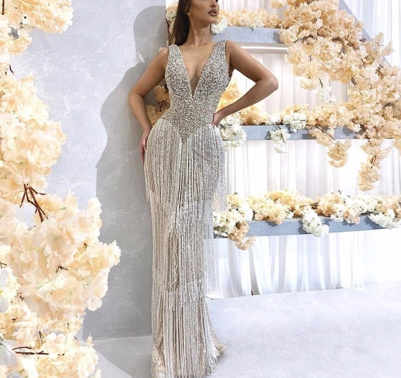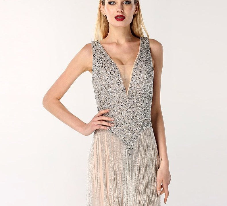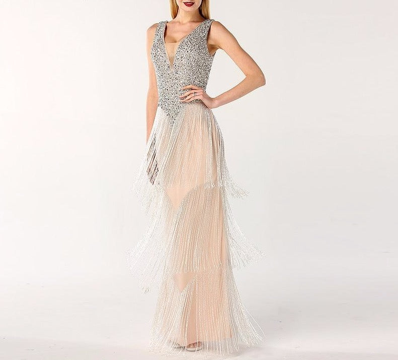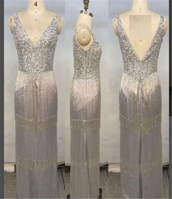 Dubai Design Grey Sexy Deep-V Evening Dresss Sequined Beading Tassel Luxury Formal Dress