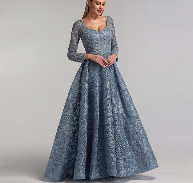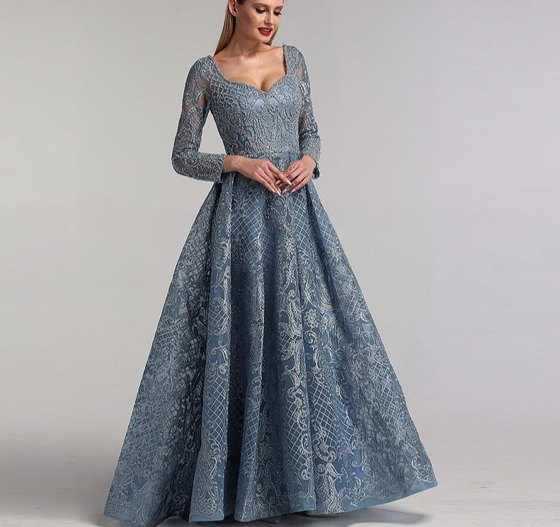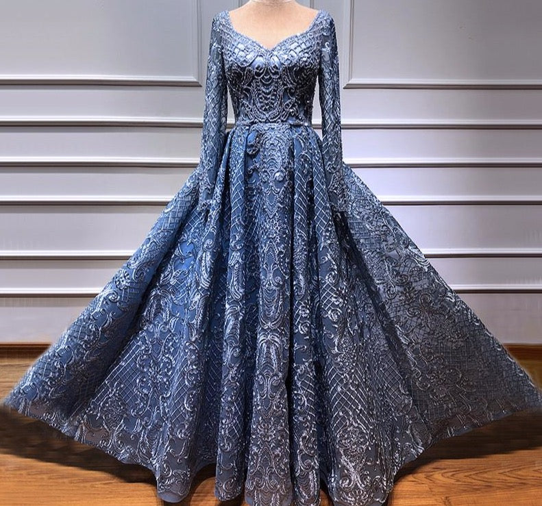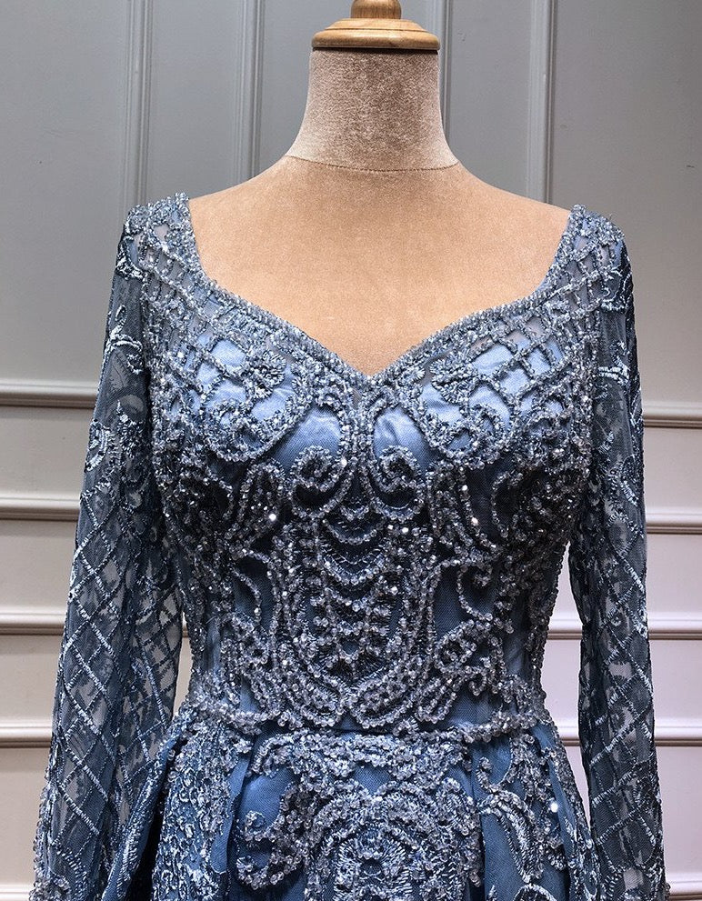 Dubai Grey Luxury V-Neck Sexy Evening Dresses Handmade Flowers Beading Long Sleeves Evening Gowns