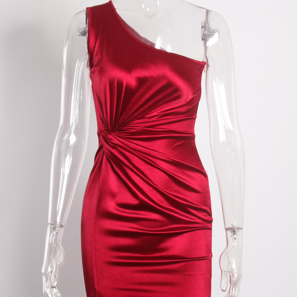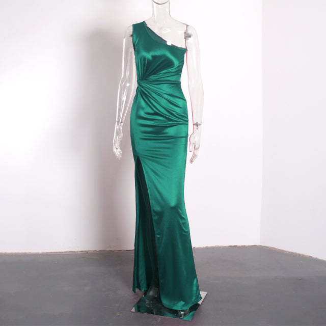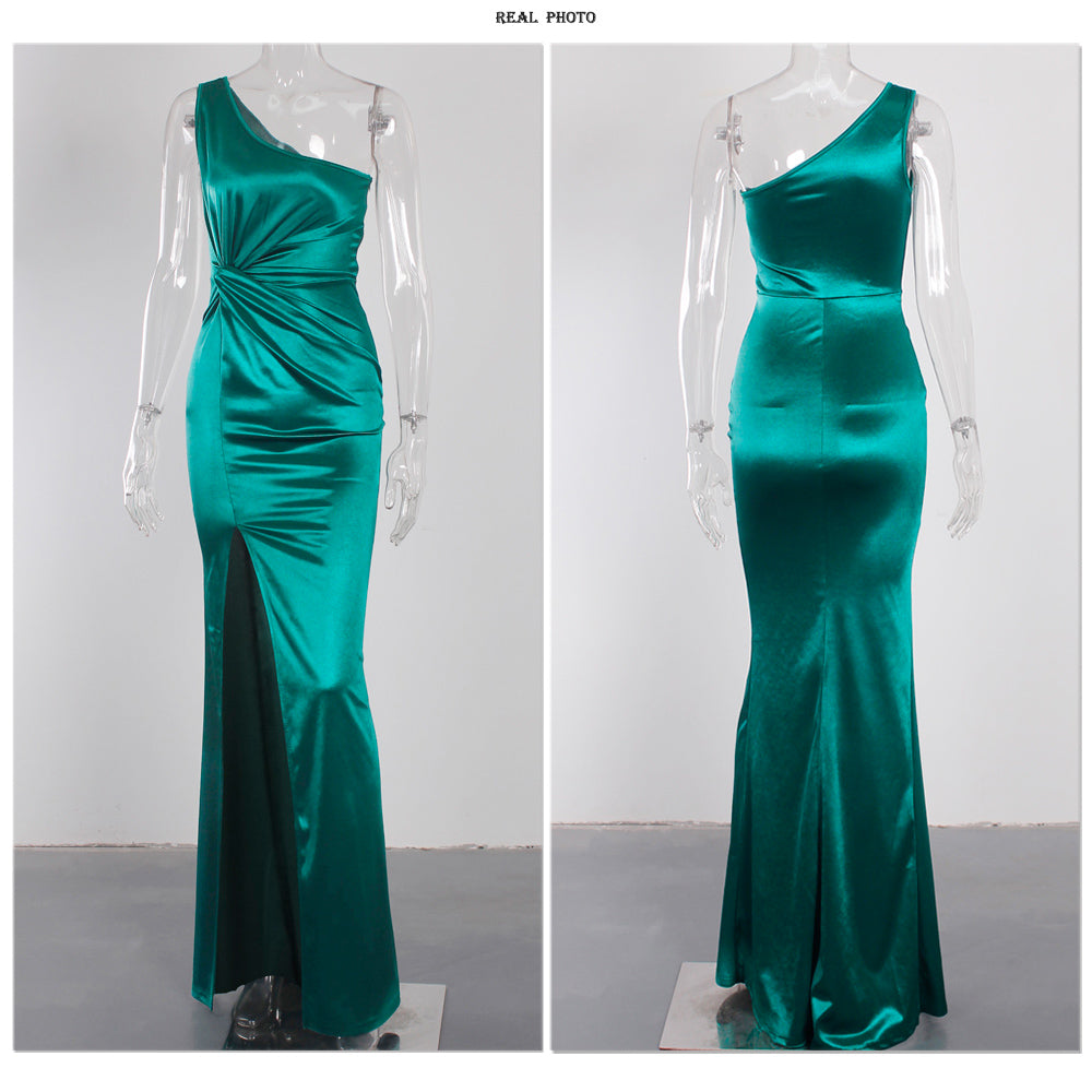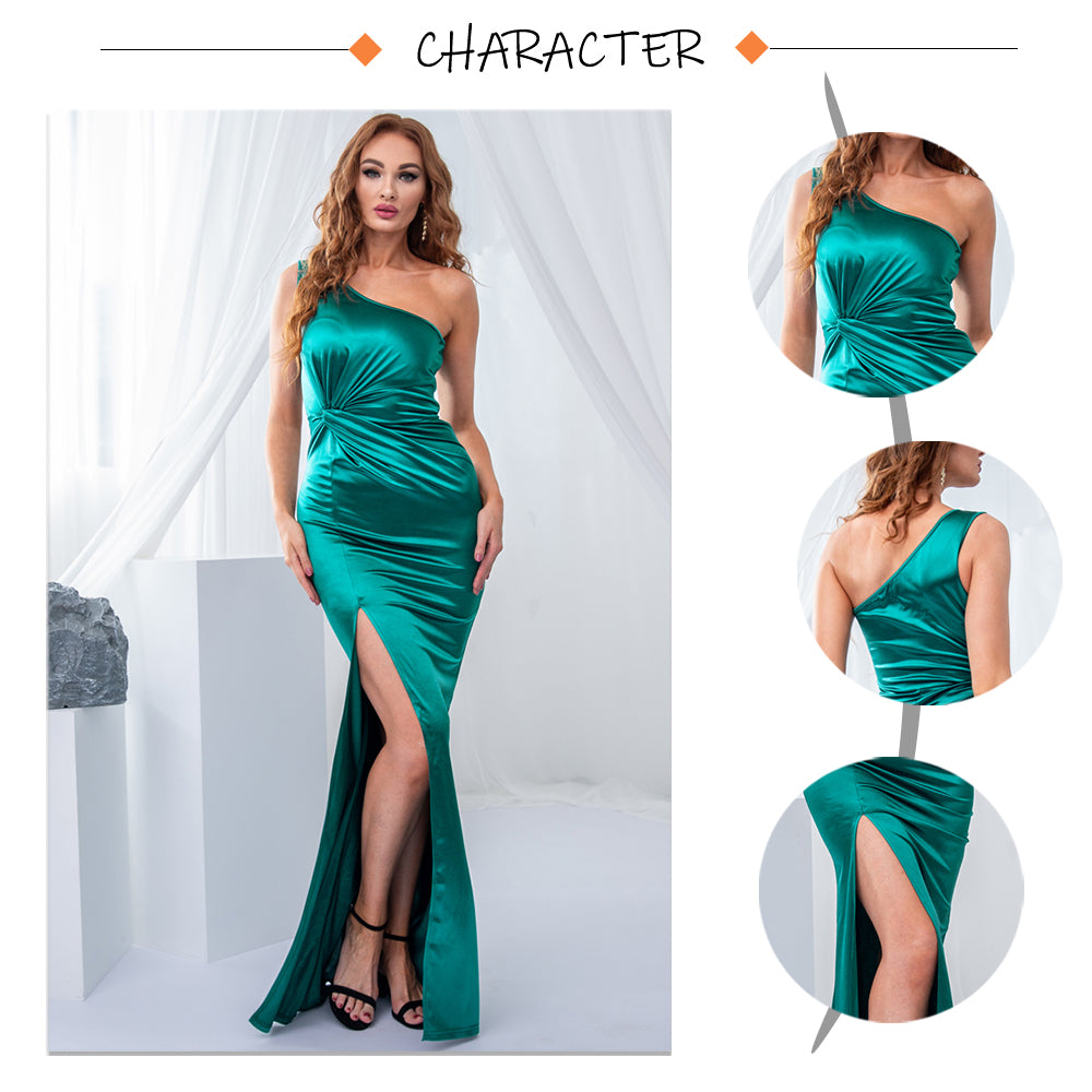 Elegant One Shoulder Evening Dresses Ladies Stretchy Satin Ruched Split