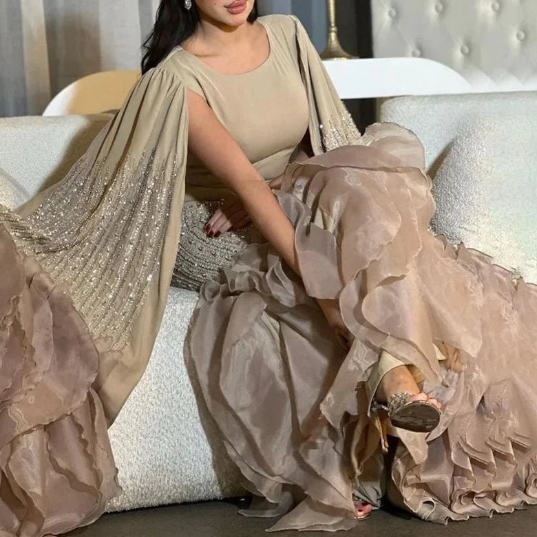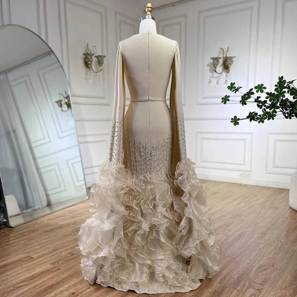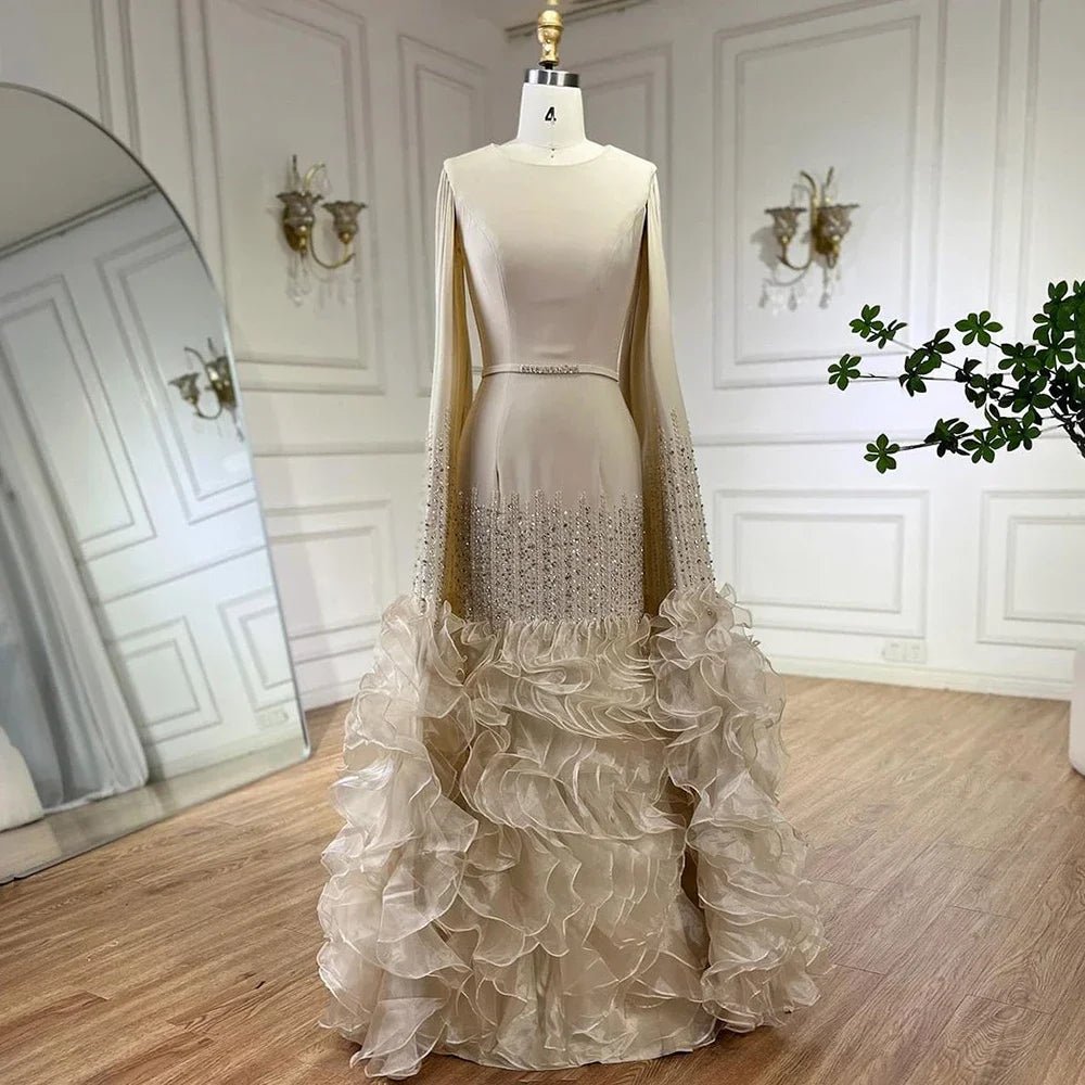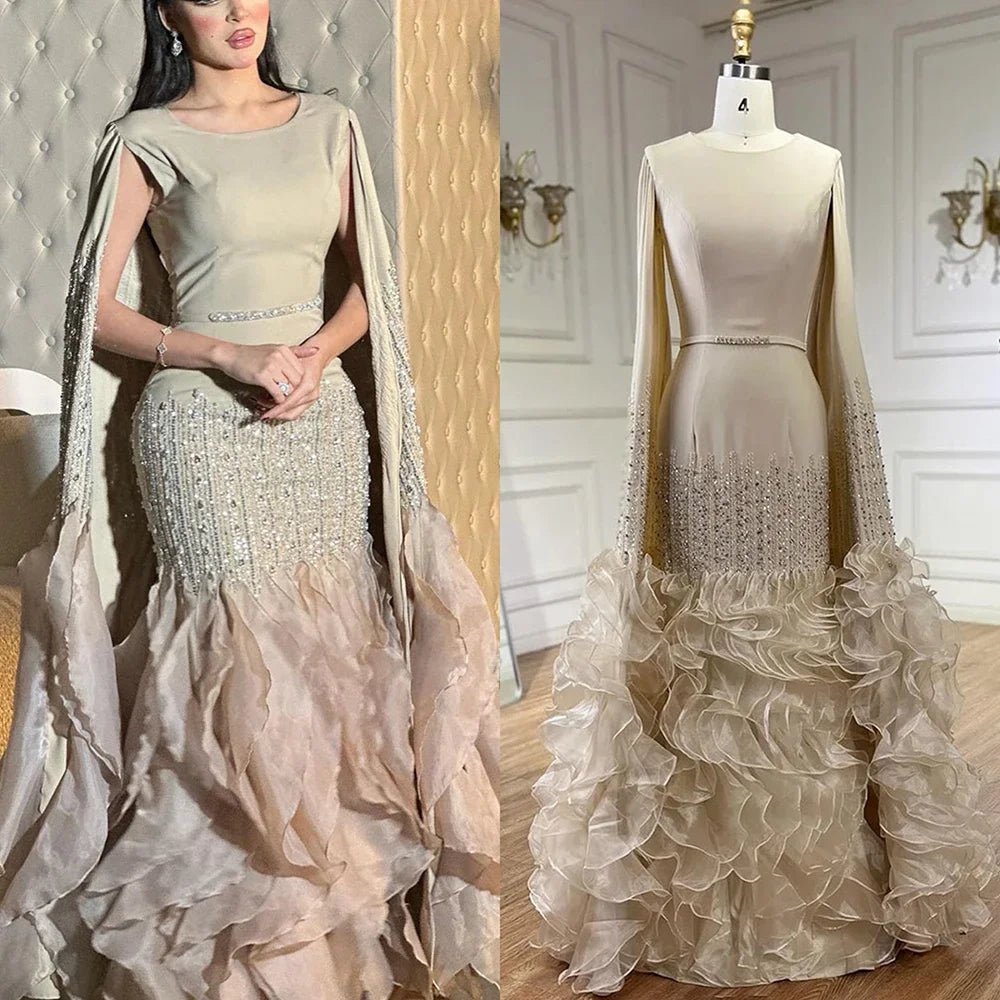Make your mark with our 2024 Caramel Mermaid Dress, a blend of conspicuous style and regal bearing. With its elegant cape sleeves and the lavish appeal of beaded satin, this dress is perfect for luxury evening events. Its mermaid silhouette enhances your figure while the shimmering beads add a luxurious sheen. Modern sophistication meets timeless glamour in this superbly crafted piece.