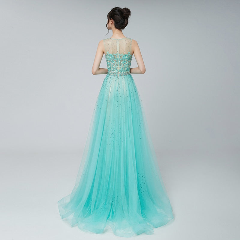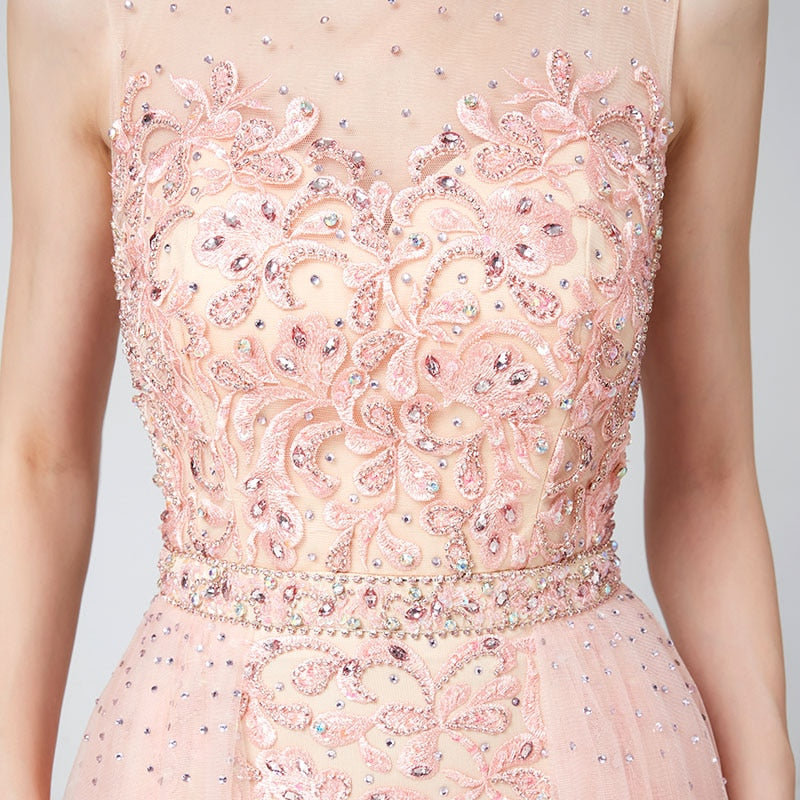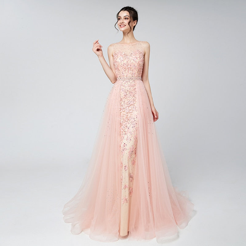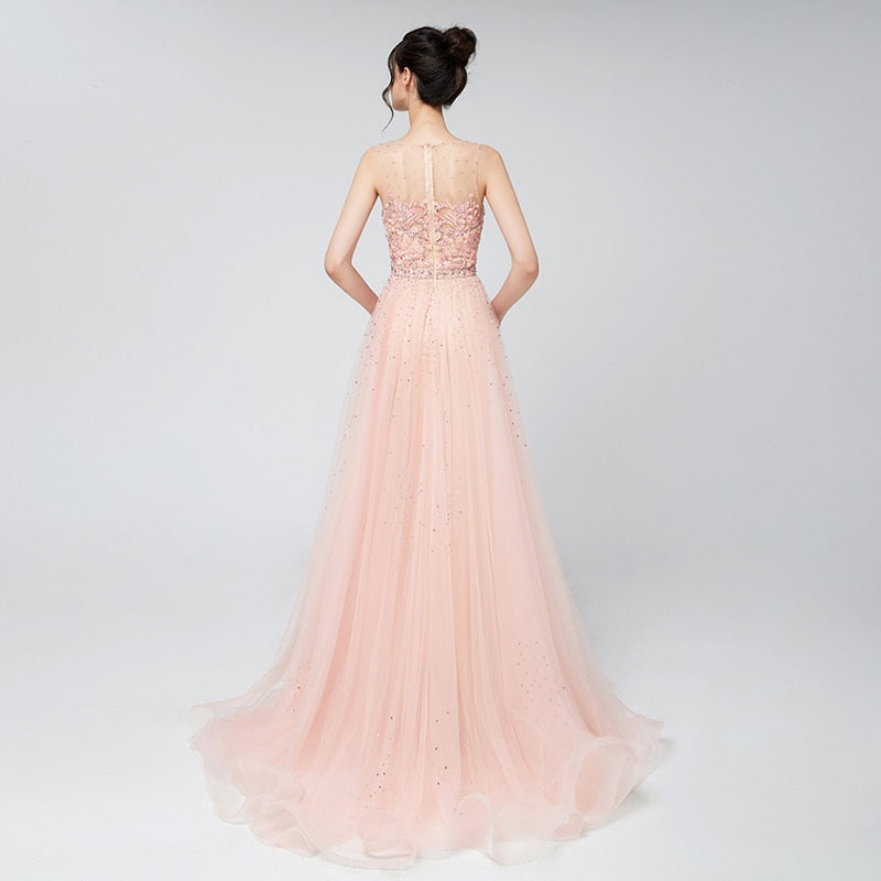 Elegant Evening Dresses Long Blush Dubai Arabic Tulle Beading Applique Formal Sleeveless Party Gowns