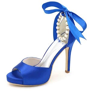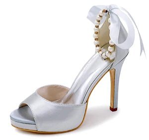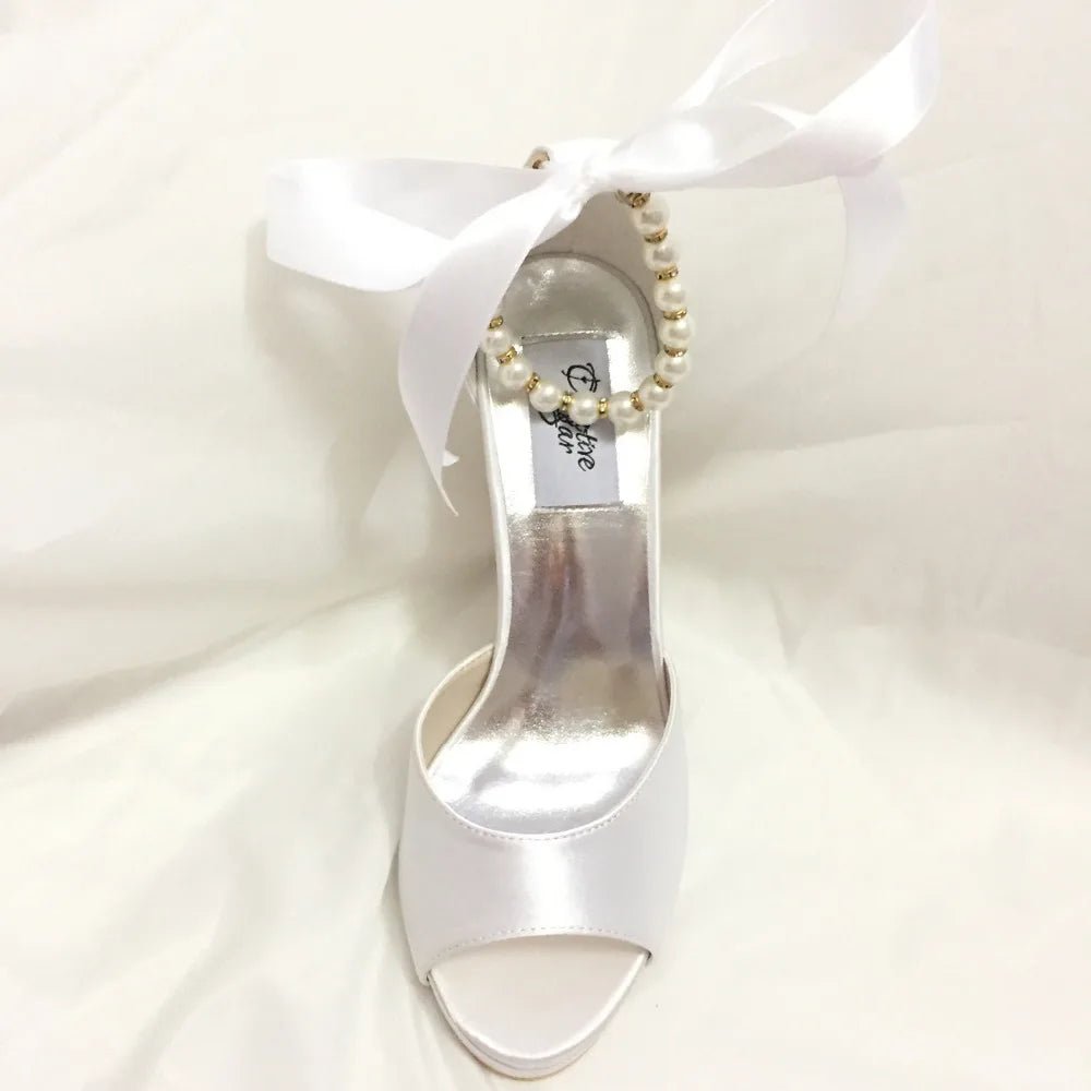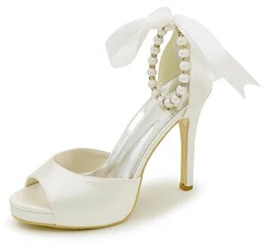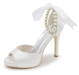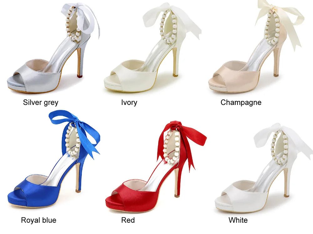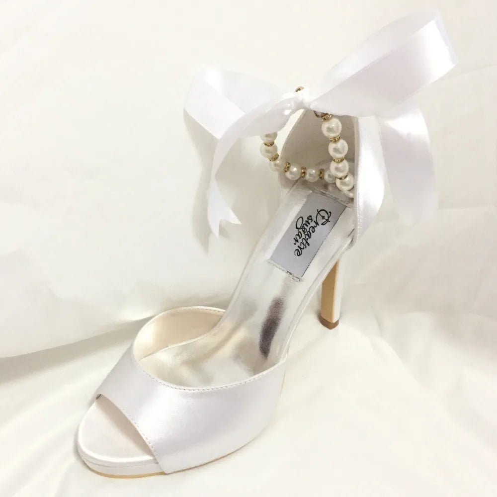 Discover these elegant satin open-toe pumps with a pearl beads ankle strap and ribbon bow. Featuring 11cm thin heels and a 1.2cm platform, perfect for bridal, wedding, and evening events. Classic and stylish with a comfortable fit.