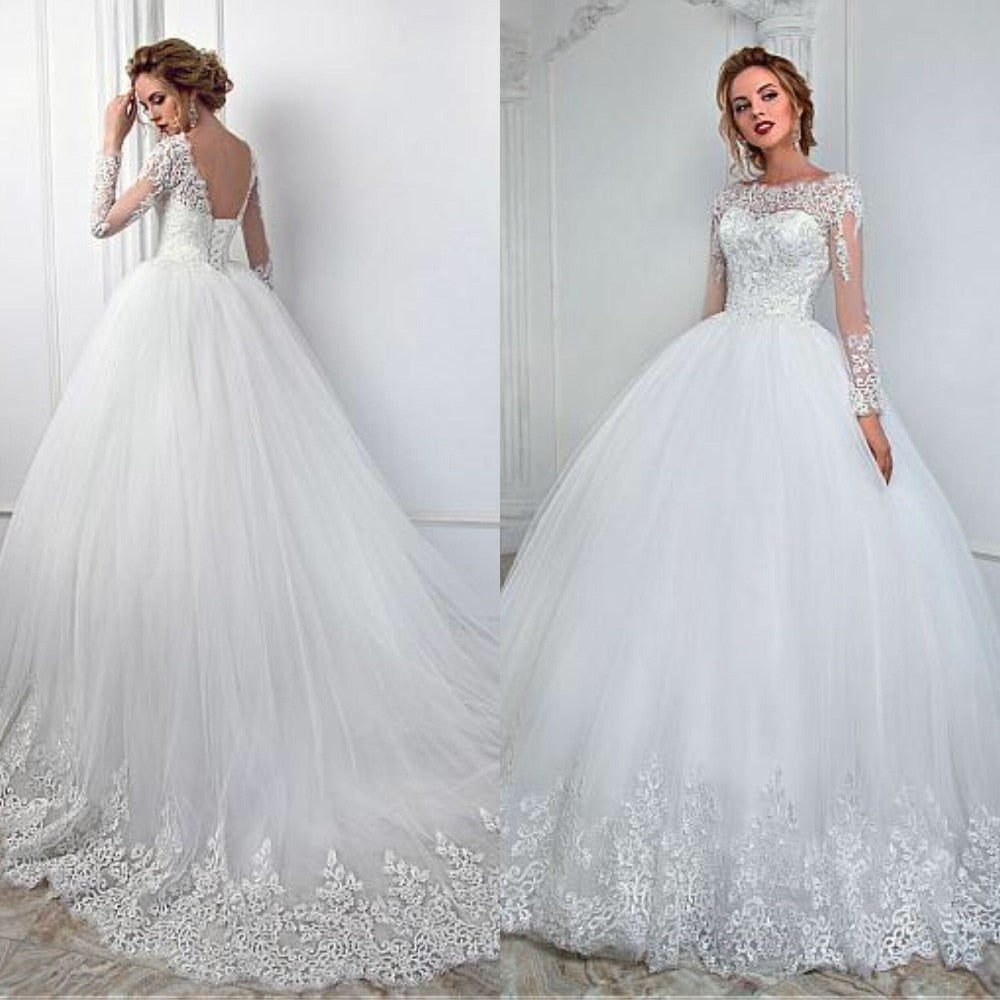 Elegant White Lace Long Sleeve Wedding Dress Ball Gown See Through Design Appliques Princess Bridal Dress Lace up Back