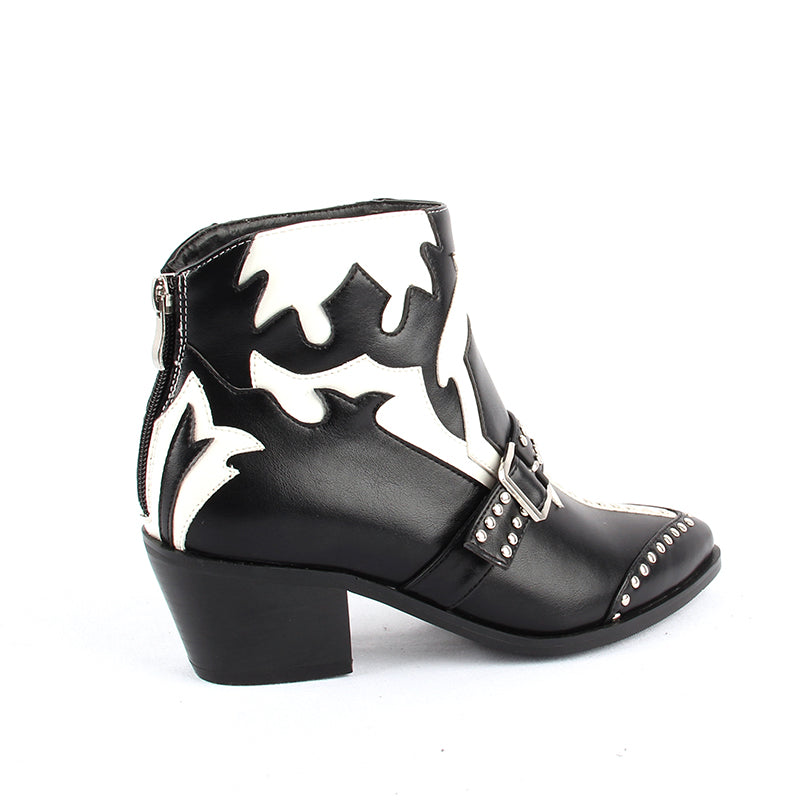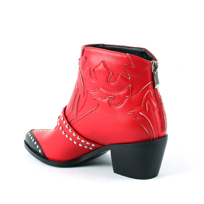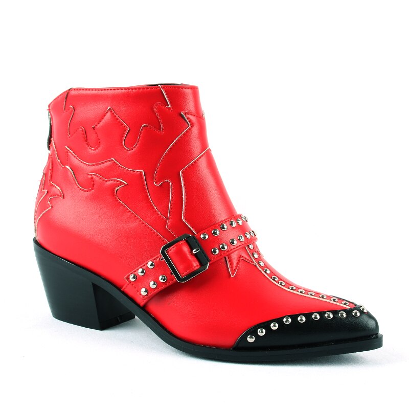 Fashion Rivets Studded Ankle Boots for Women Pointed Toe Buckle Kitten Heels Winter Shoes Ladies Black Red Leather Cowboy Boots