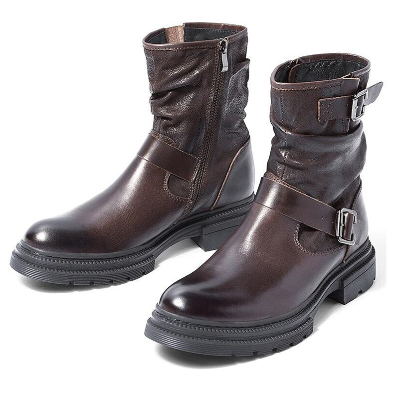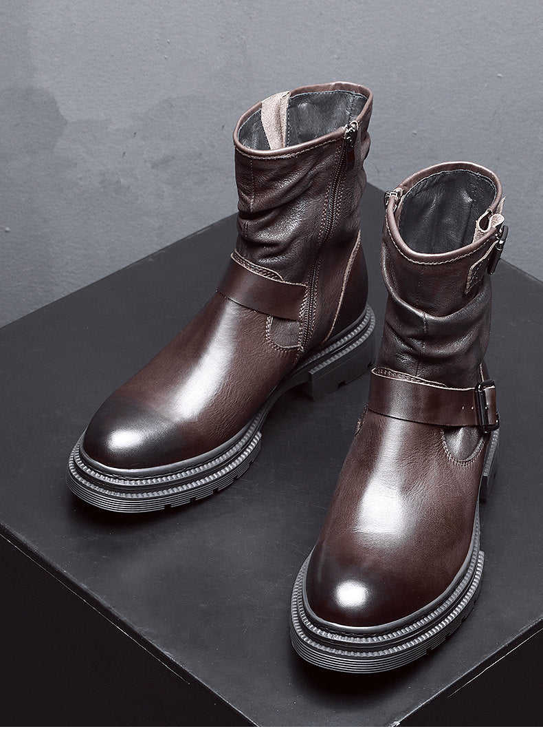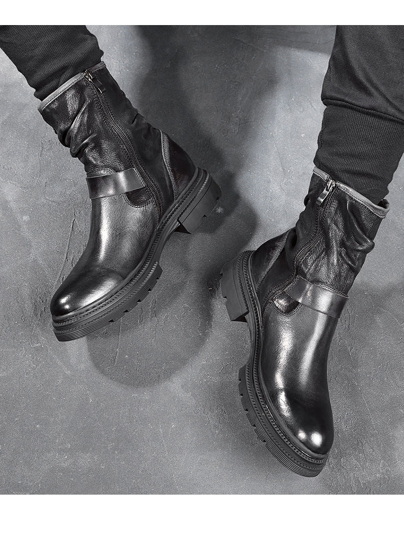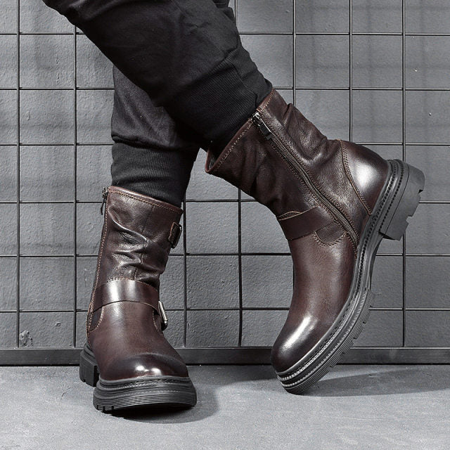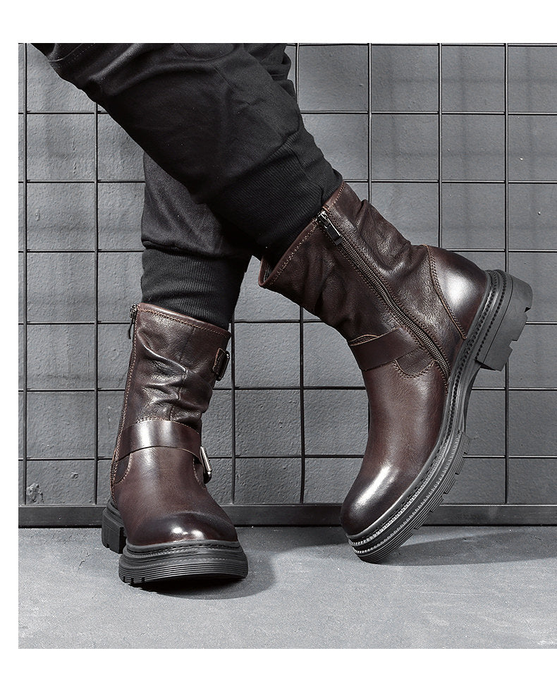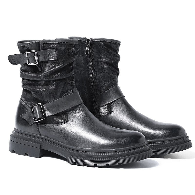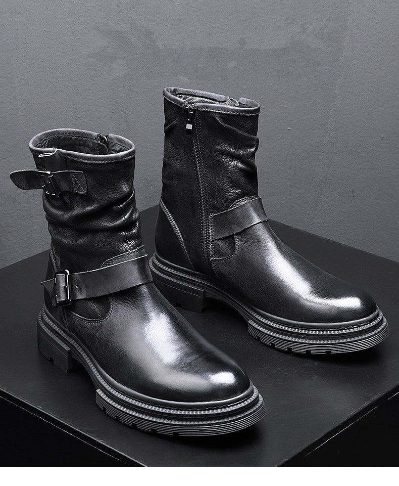 Men Full Grain Leather Pure Black Motorcycle Boots Winter