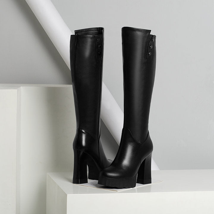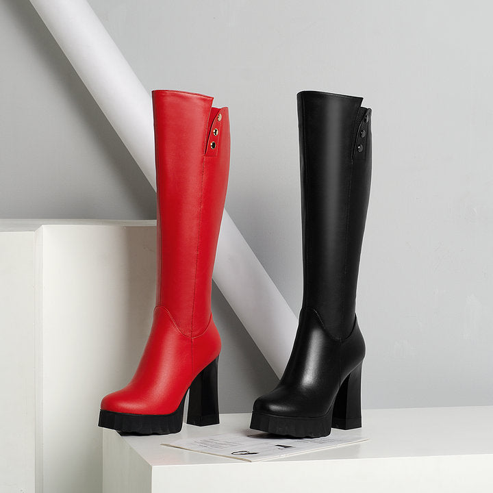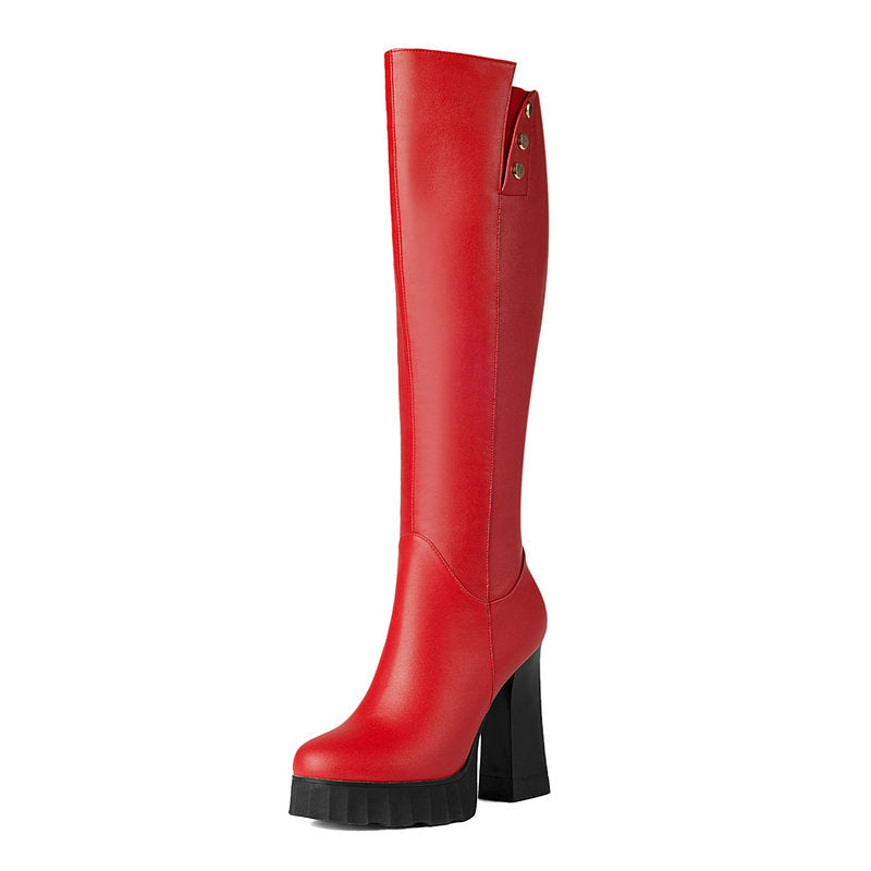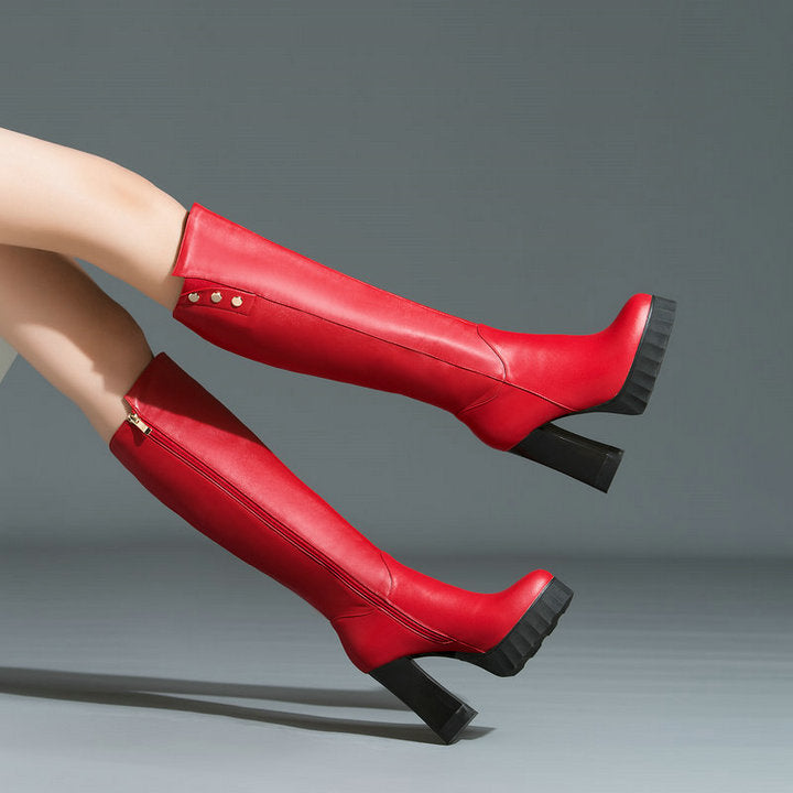 Female Genuine Leather Thick High Heel Zipper Knee High Boots Fashion Rivet Round Toe Winter Women Shoes Black Red