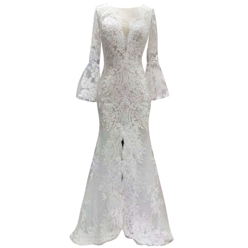 Long Sleeve Lace Trailing Waist Fishtail Slim High Slit Wedding Dress