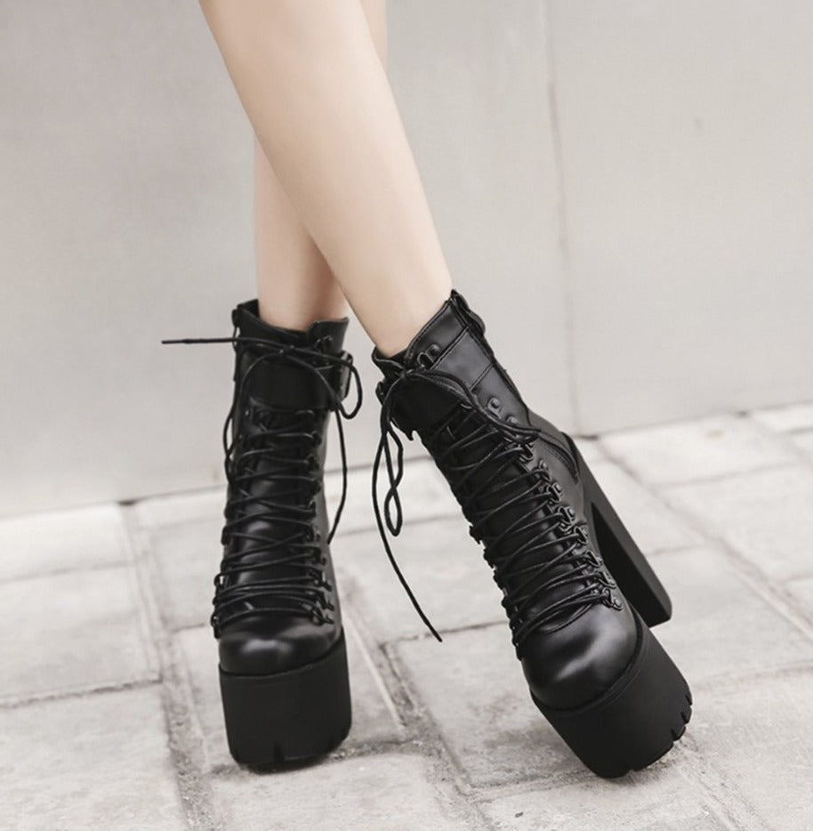 Fashion Motorcycle Boots Women Leather Spring Autumn Metal Buckle High Heels Shoes Zipper Black Ankle Boots Woman Lacing