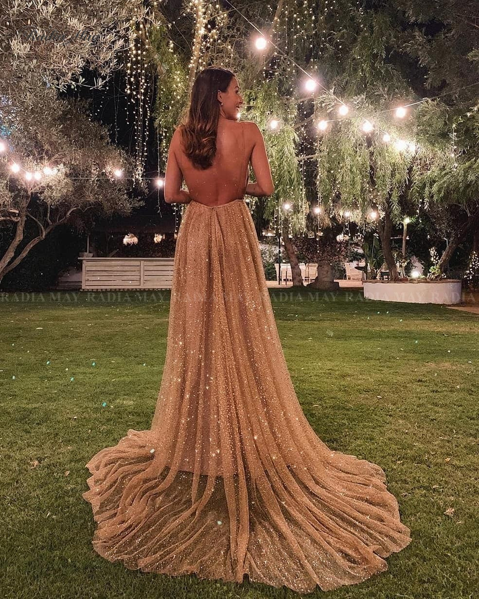 Glitter Sequin Rose Gold Long Prom Dresses Sexy Spaghetti Straps Backless Arabic Evening Gowns Women Formal Party Dress