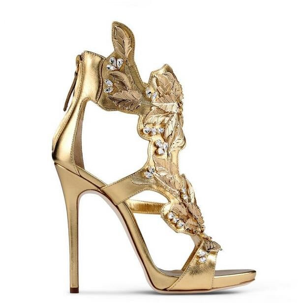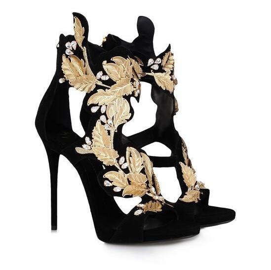 Gold Metallic Leaf Decor High Heel Sandals For Women Peep Toe Crystal Dress Shoes Black Suede Stiletto Heels Pumps Real Photo