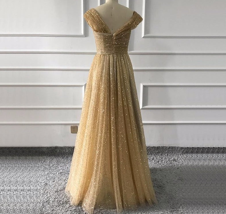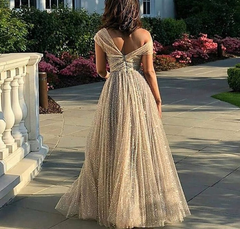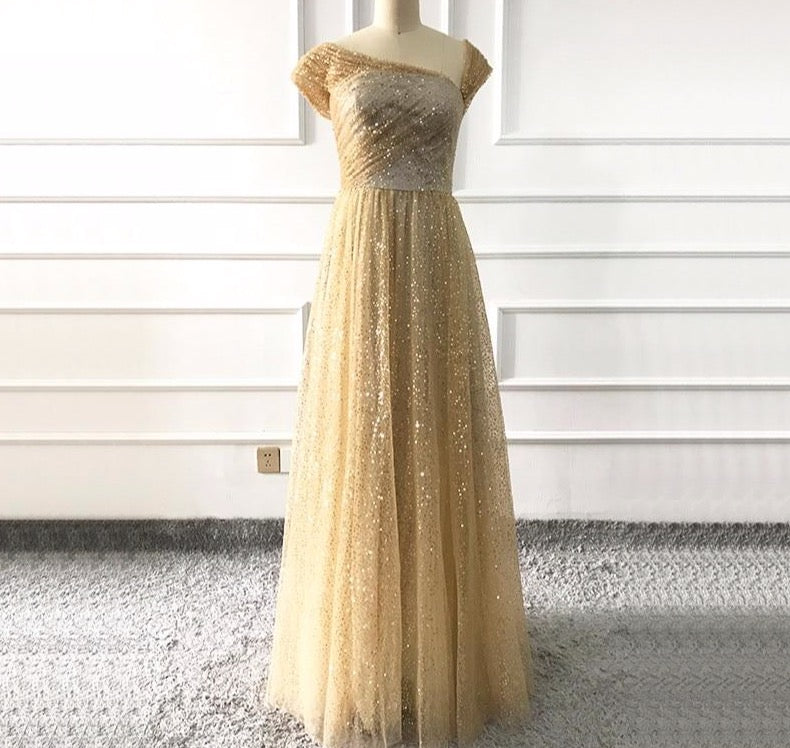 Gold One Shoulder Sexy Evening Dresses A-Line Design Sparkle Formal Gowns