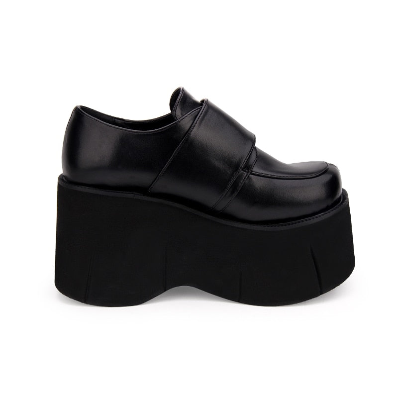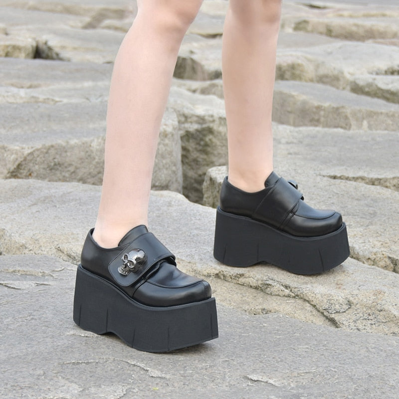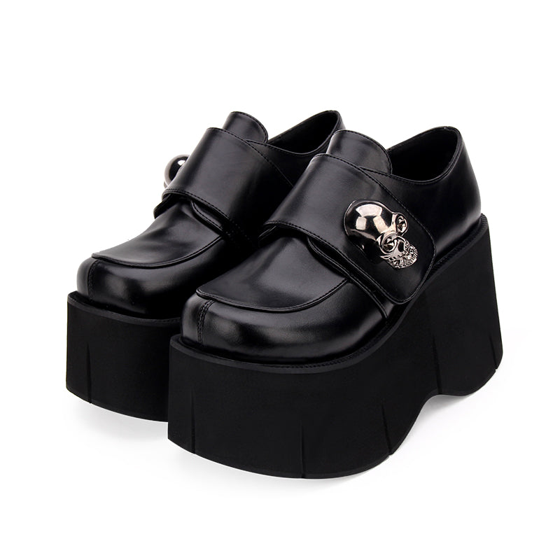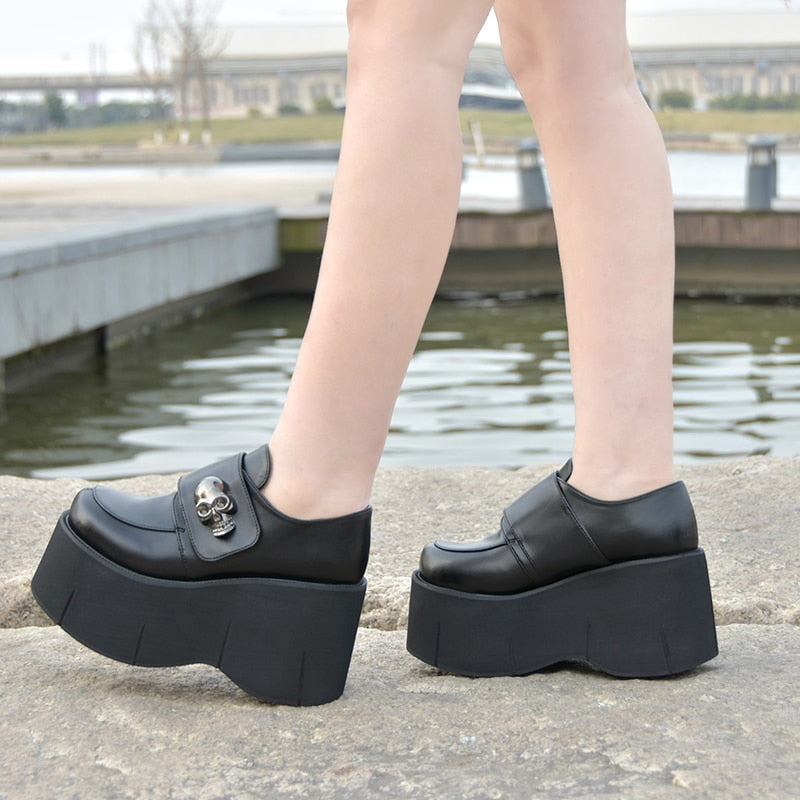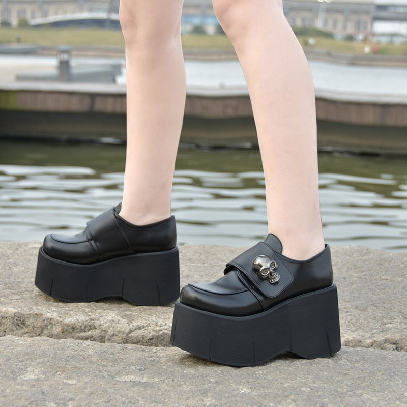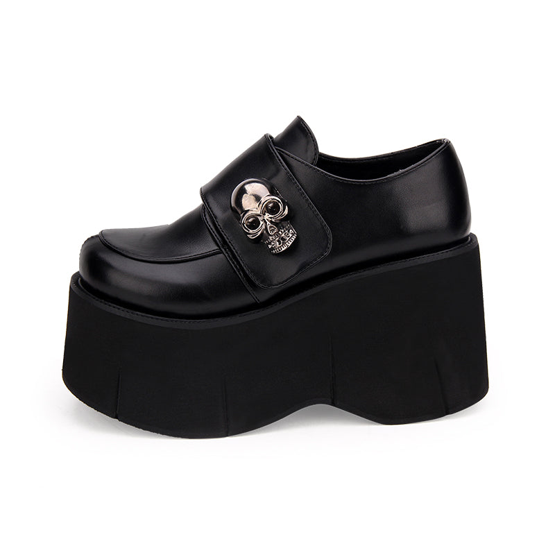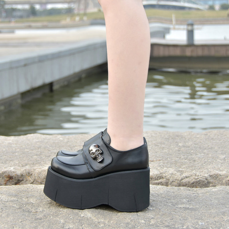 Gothic Skull Punk Lolita Cosplay Thick Platform Slip-on Oxford Japanese School Uniform Black Shoes