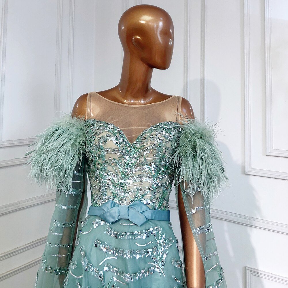 Green Capes Sleeves Luxury Evening Dresses Gowns Beaded Feather