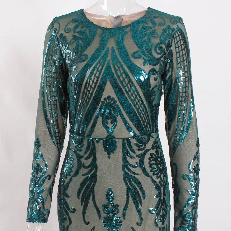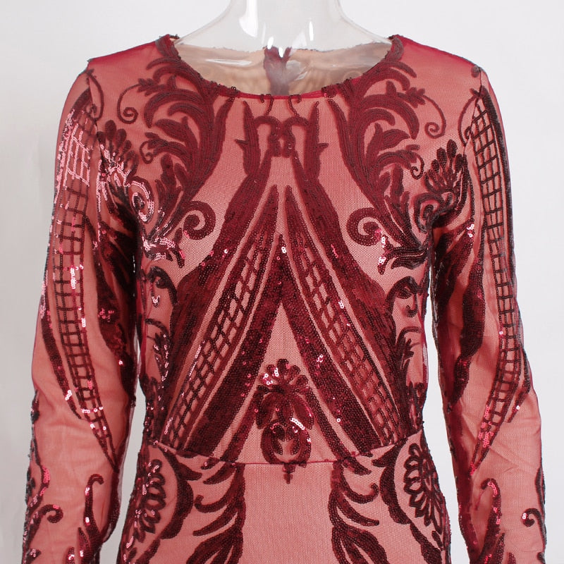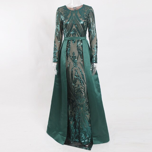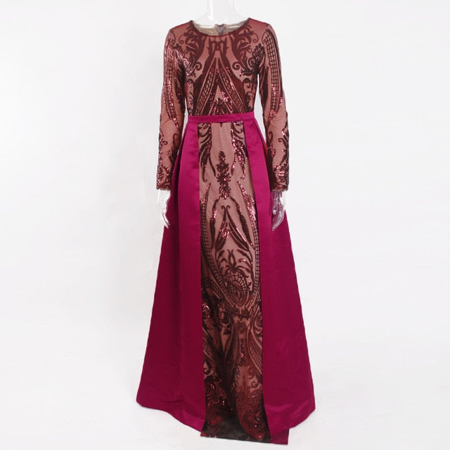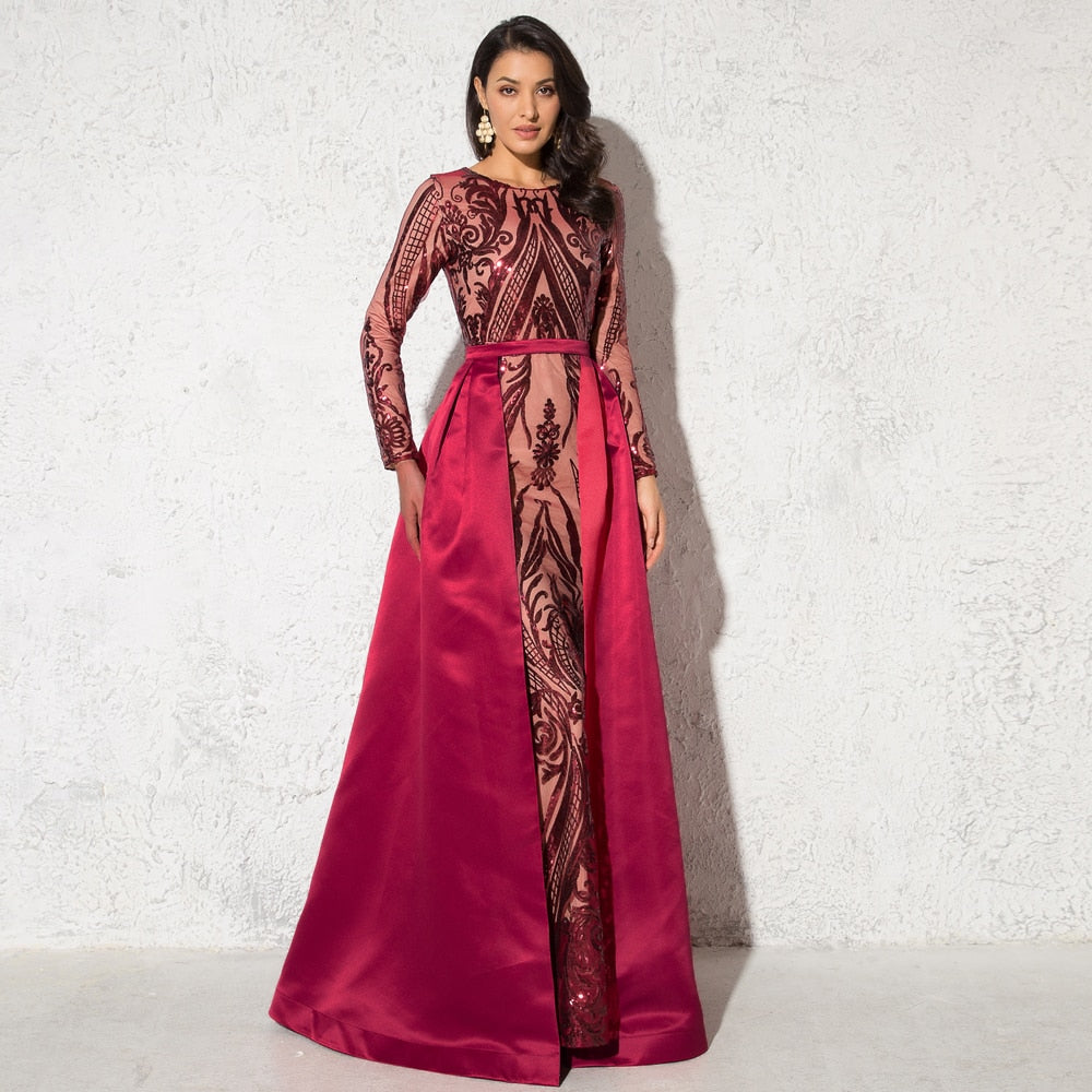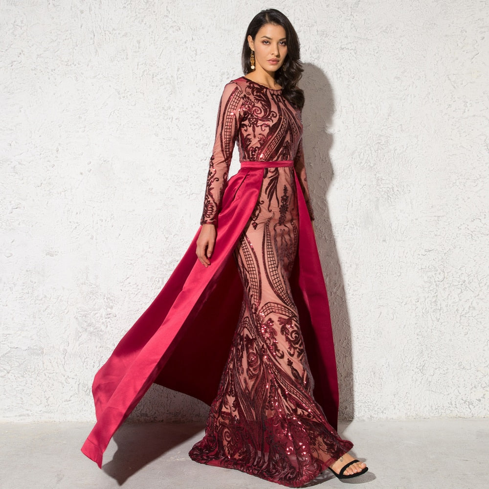 Green Sequined O Neck Full Sleeved Evening Party Dress Stretchy Floor Length Ball Gown with Detachable Train Burgundy