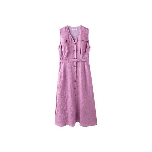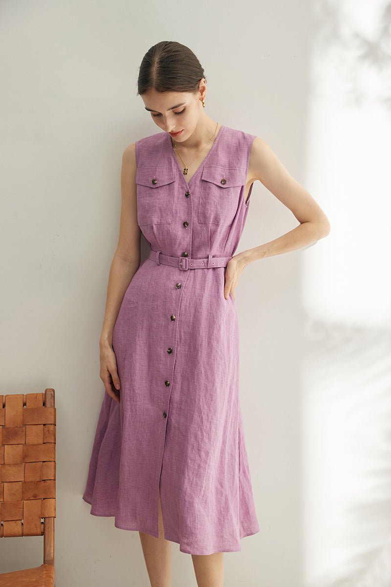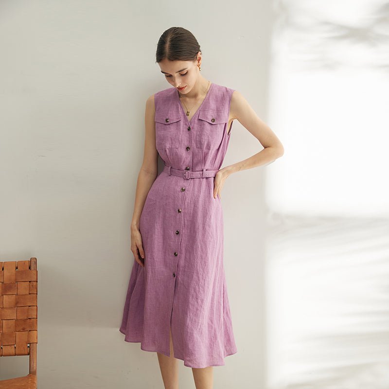 High Density Floral Linen V-Neck Sleeveless Shirt Dress