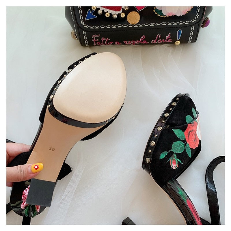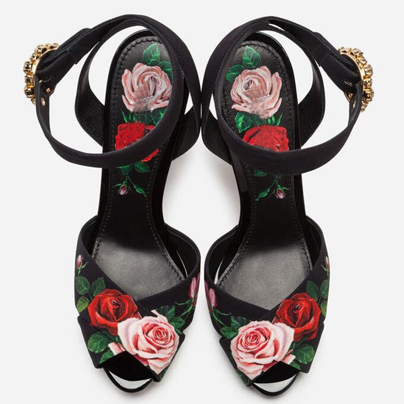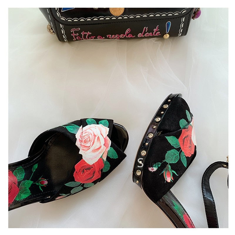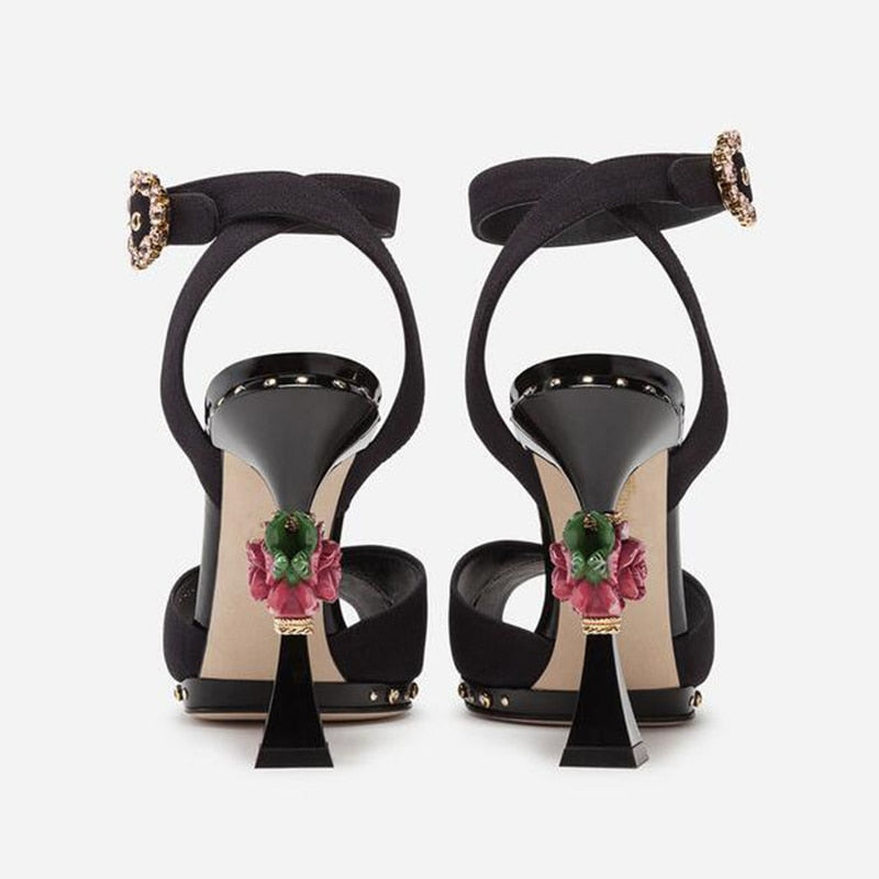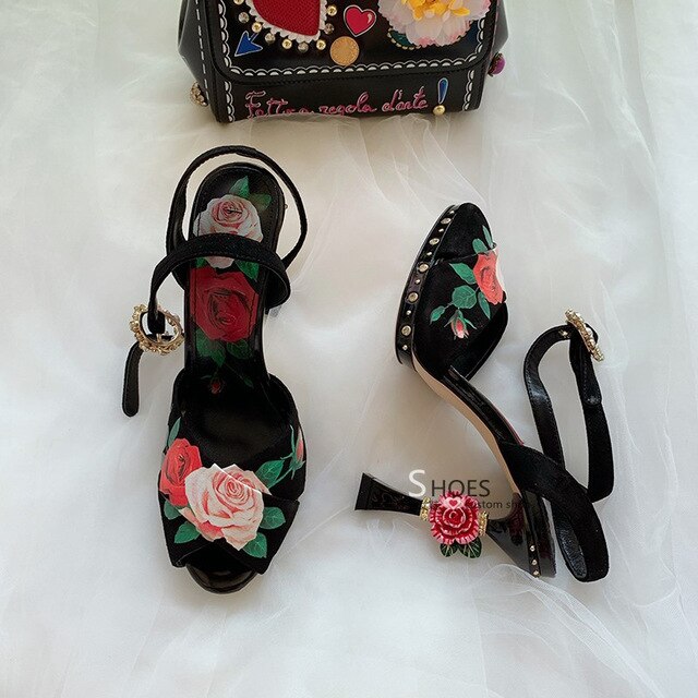 High end design high heels rose flower insert strange heel summer sandals floral printing formal wedding party shoes women