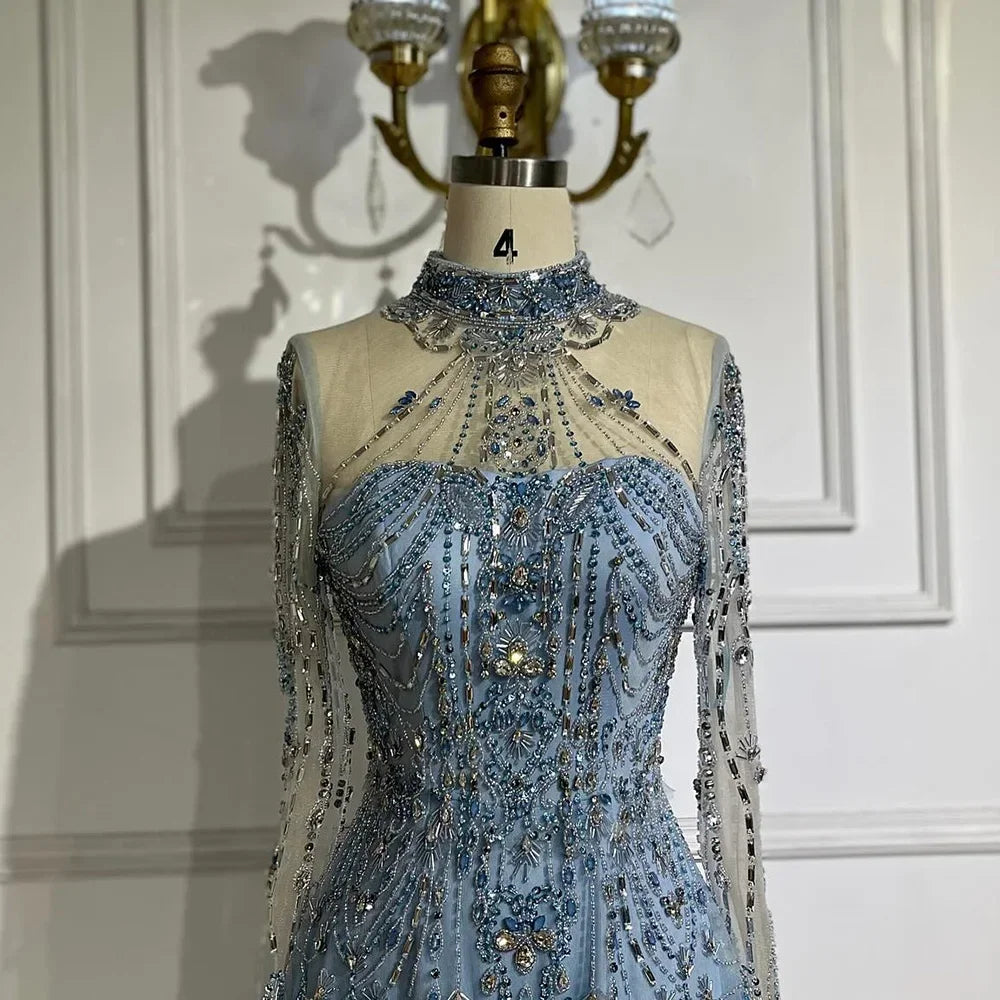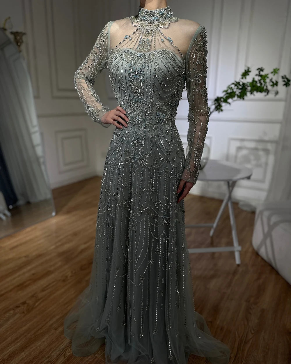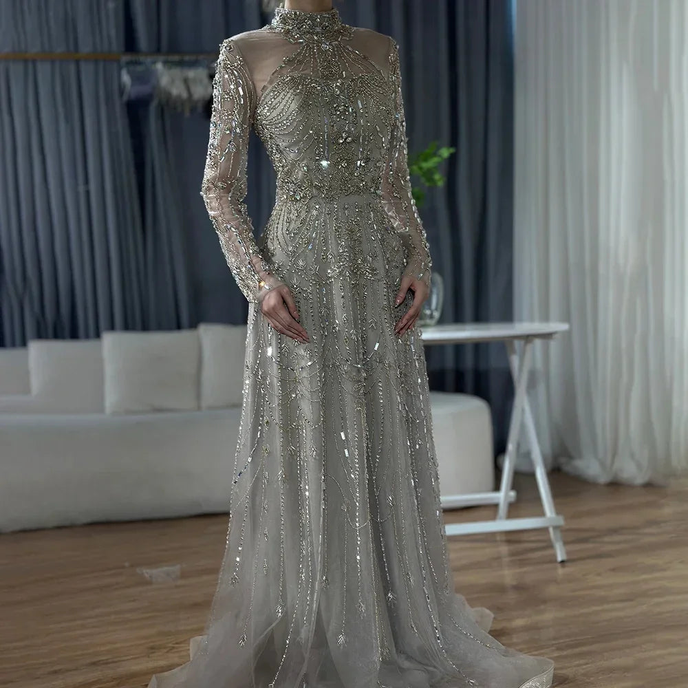 High Neck A-Line Wedding Party Dress with Lace & Beading – Long Sleeve Tulle Gown