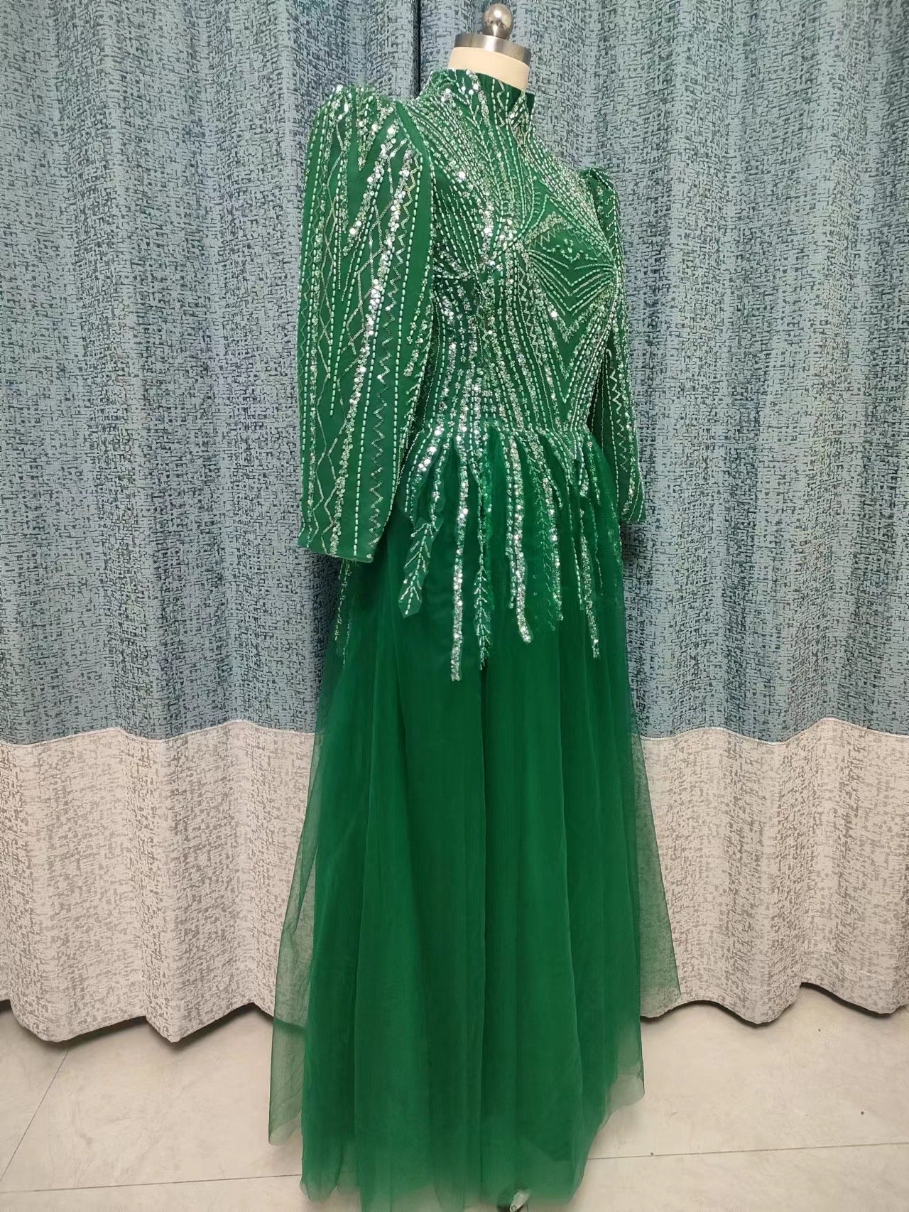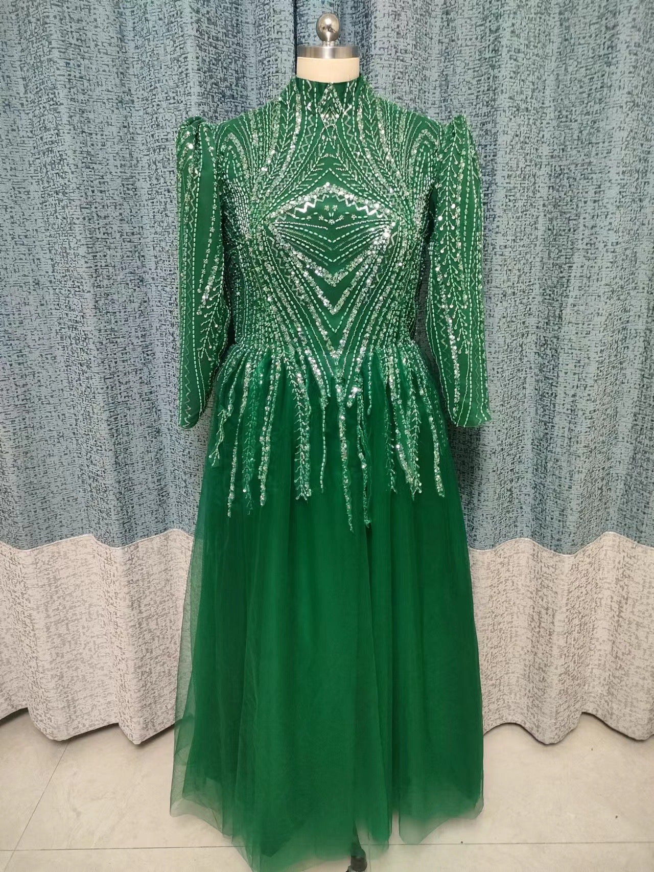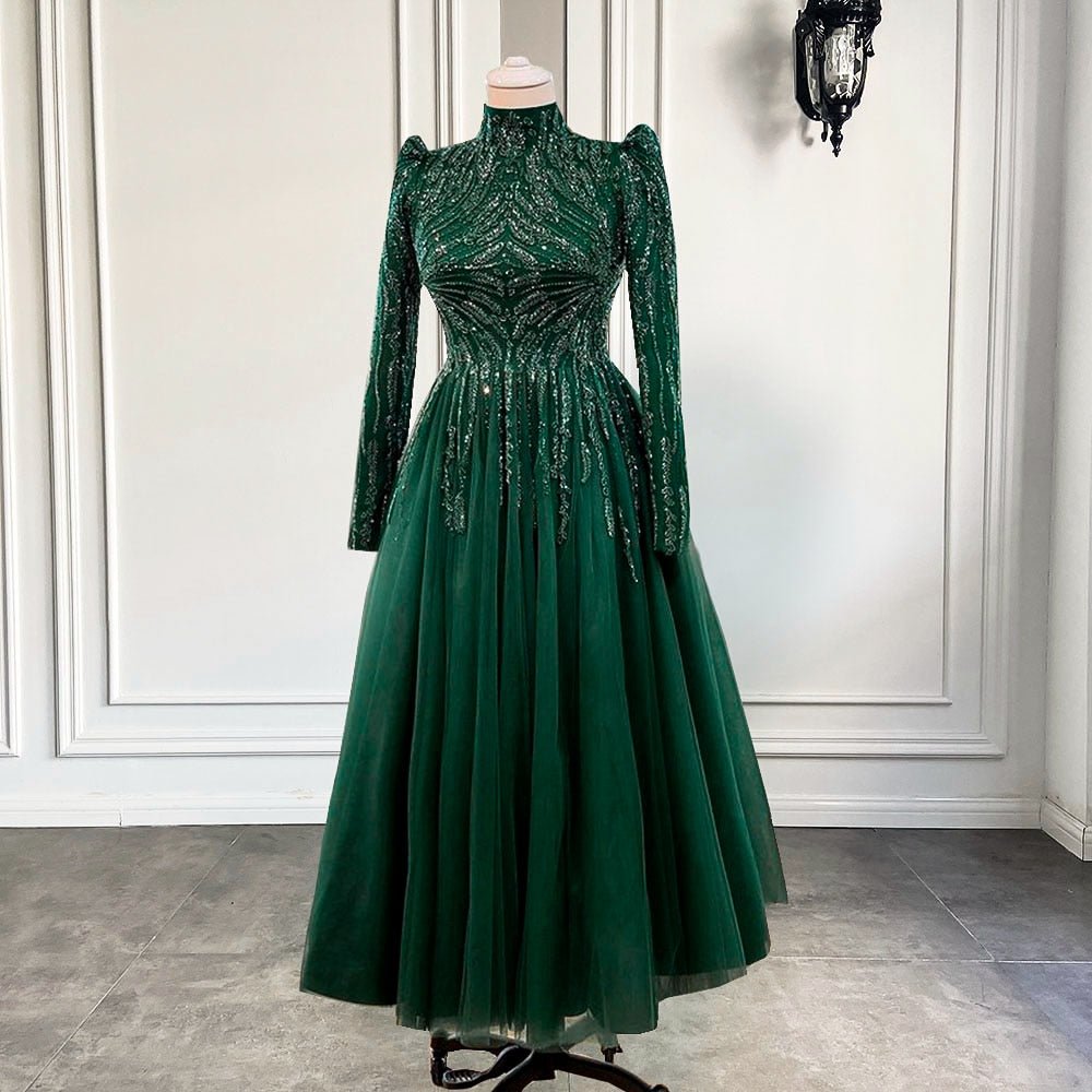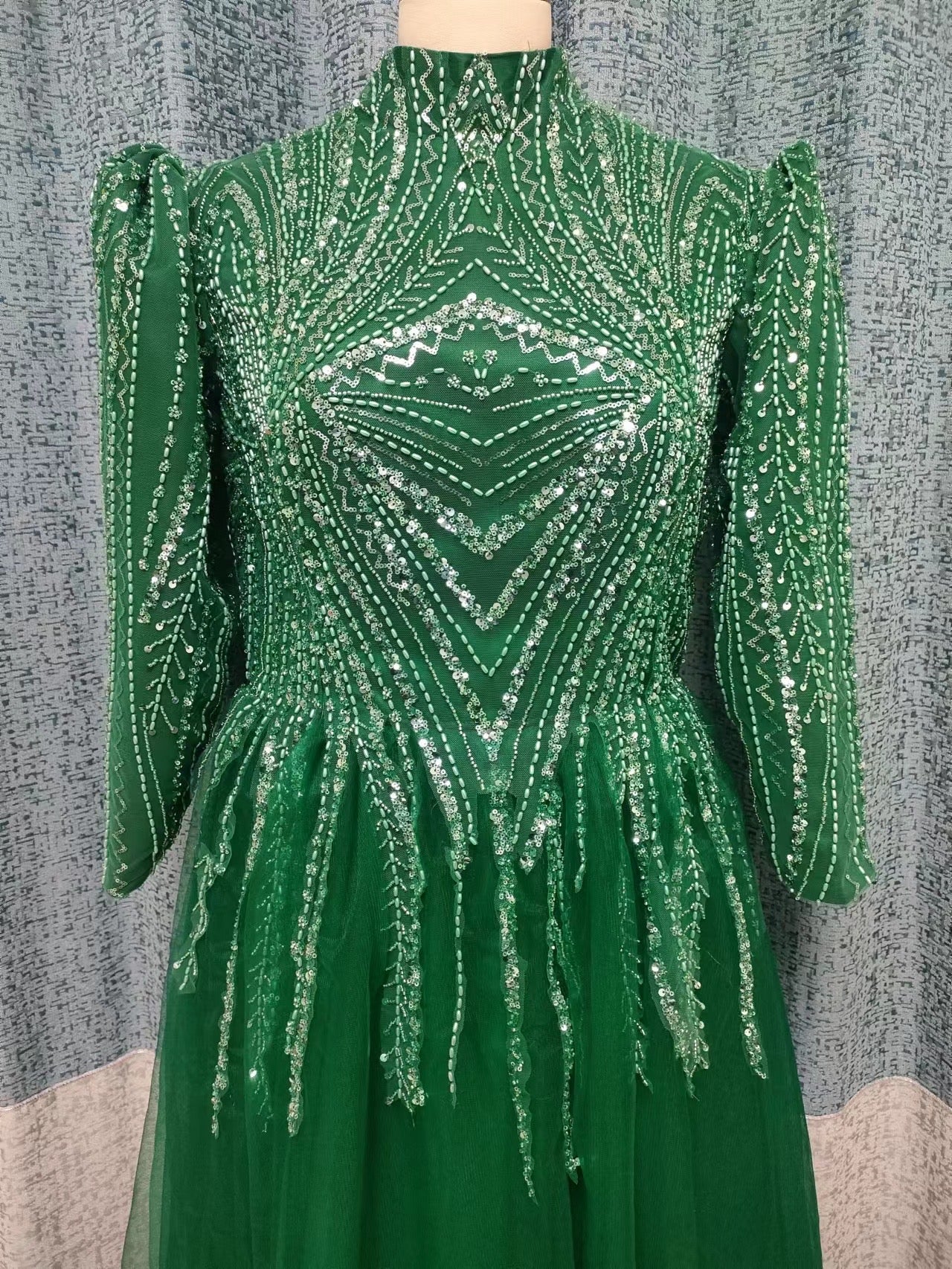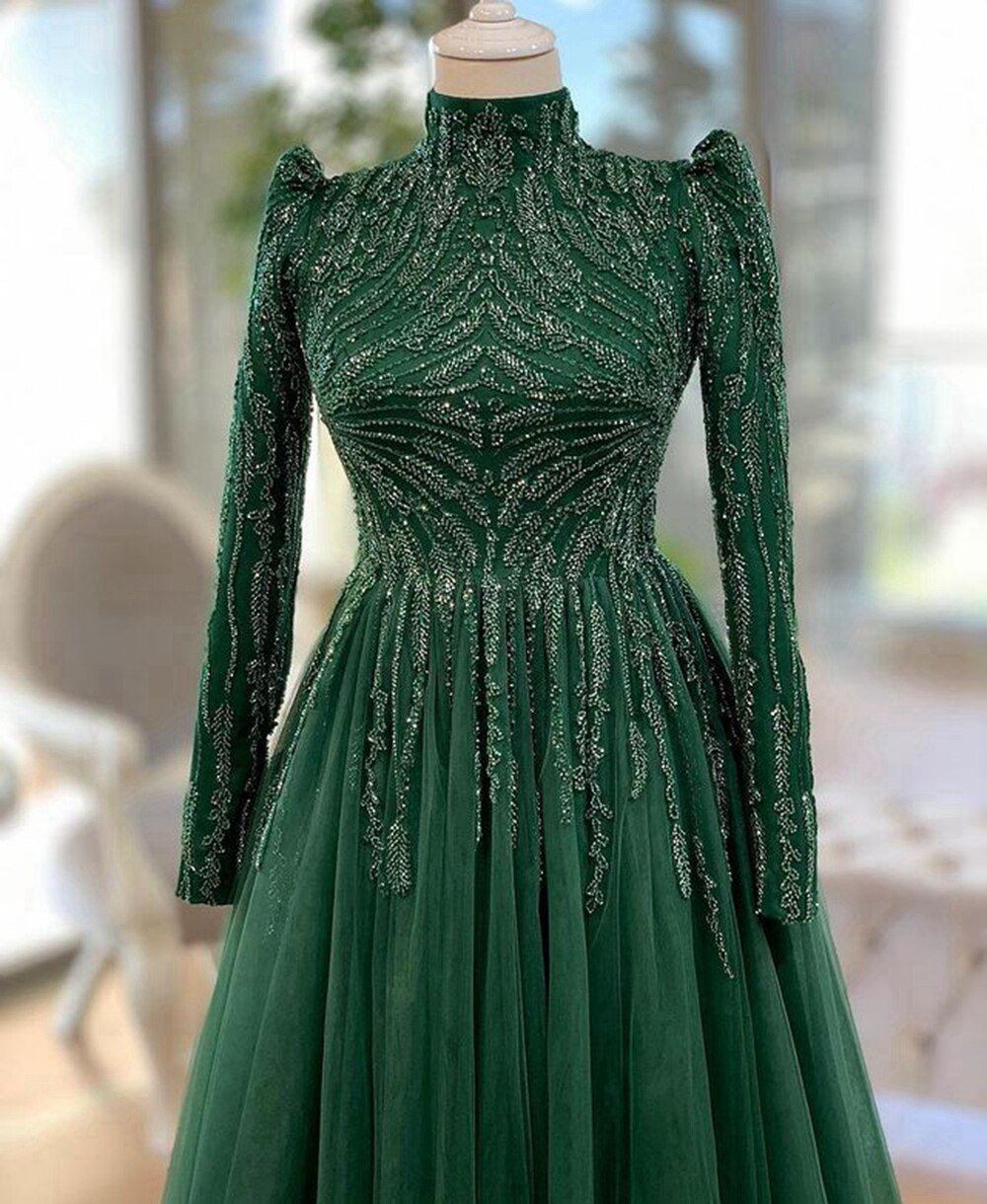 High Neck Luxury Beaded Emerald Green Tulle Women Formal Party Gowns