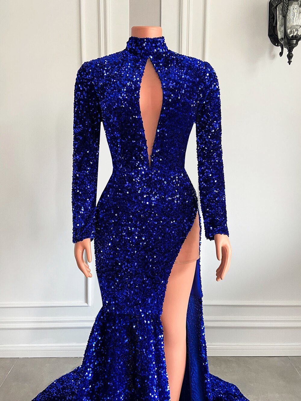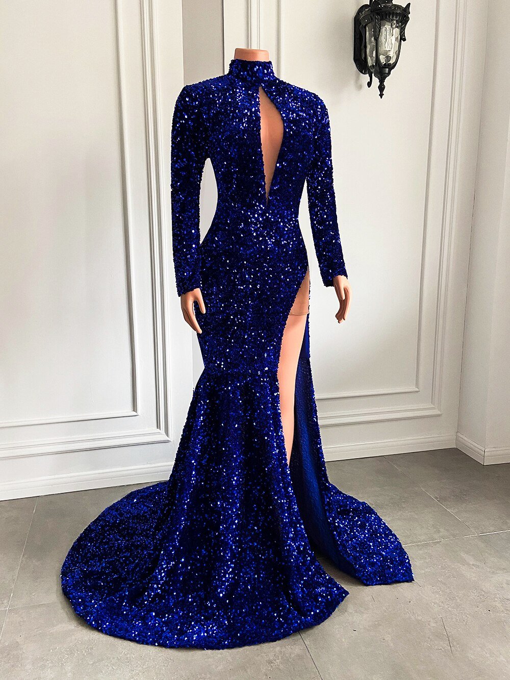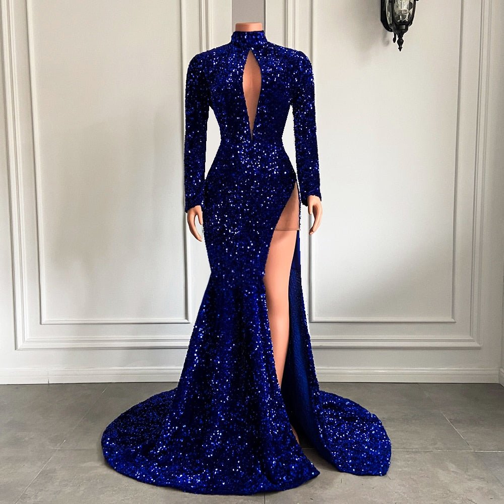 High Neck Side Slit Sparkly Royal Mermaid Prom Gala Party Gowns