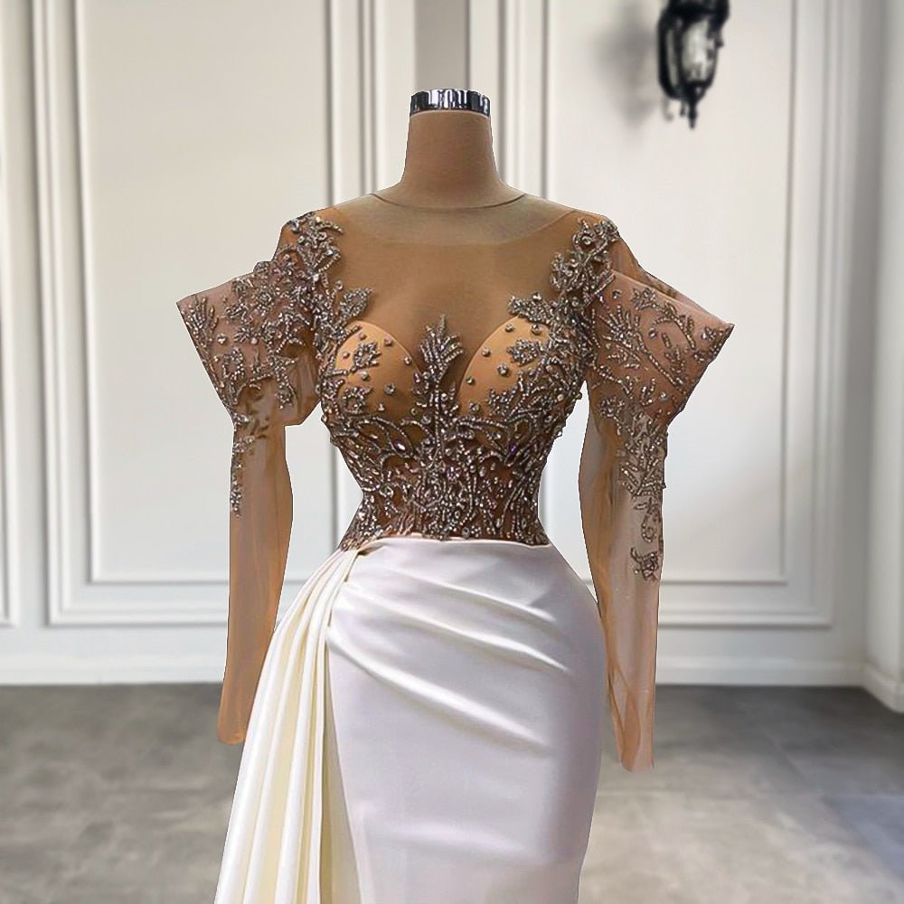 High Slit Sparkly Beaded Crystals White Satin Women Evening Dresses