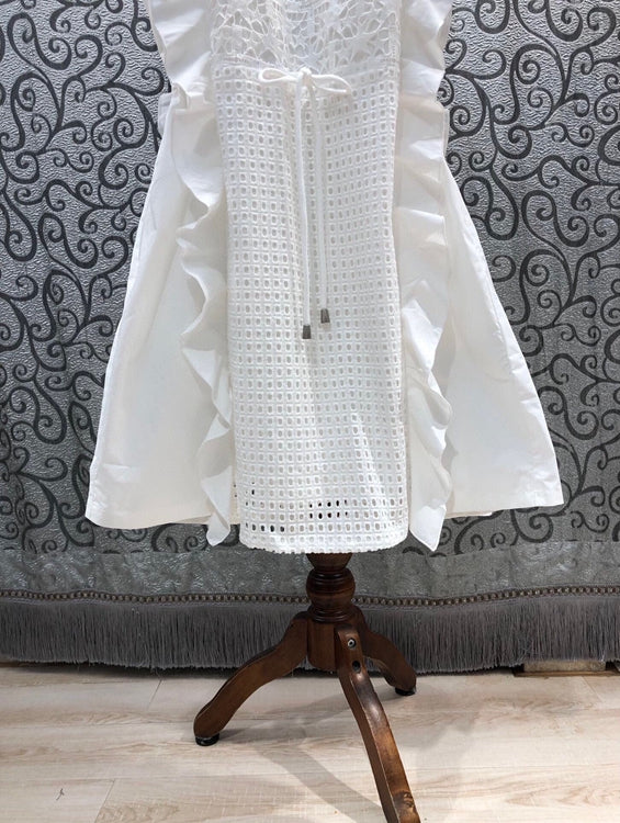 Hollow Out Embroidery Dress Women Drawstring Waist Ruffle Elegant