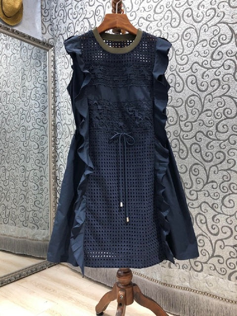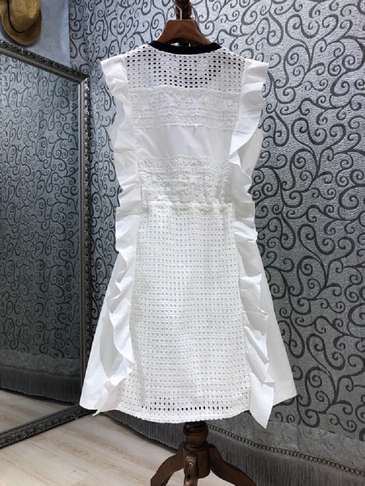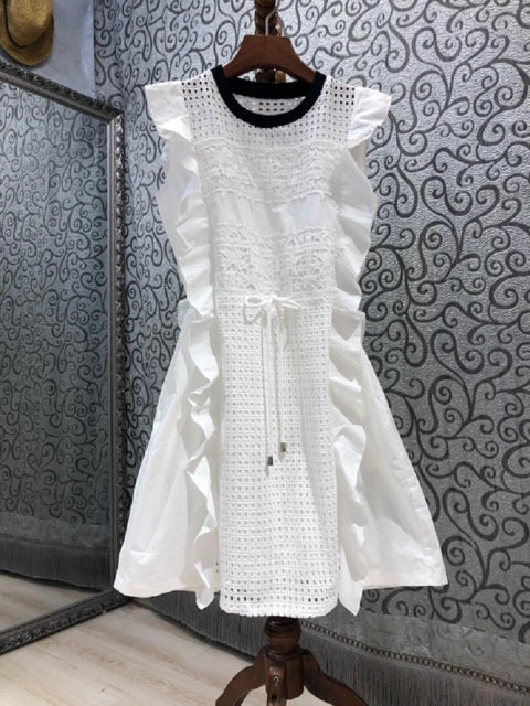 Hollow Out Embroidery Dress 2021 Summer Fashion Style Women Drawstring Waist Ruffle Elegant Sleeveless White Green Blue Dress
