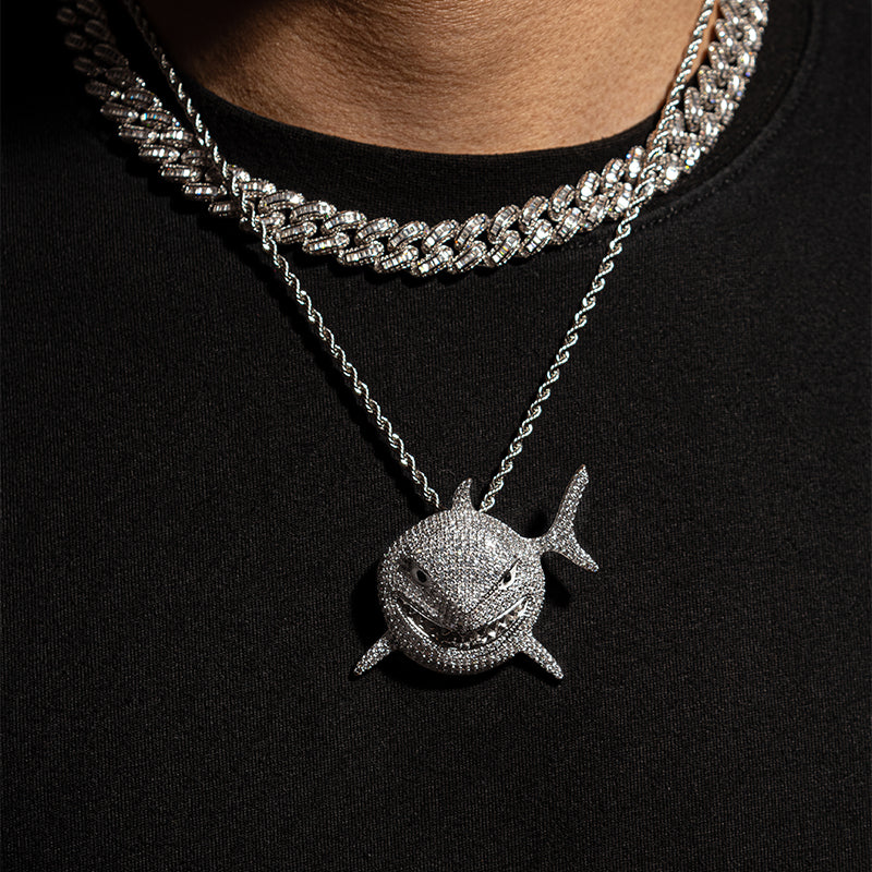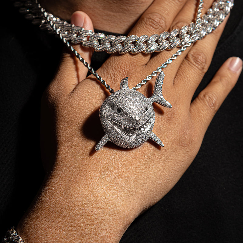 Iced Out Shark Pendant Necklace, Silver-Tone, Hip-Hop Jewelry