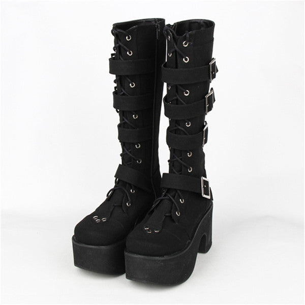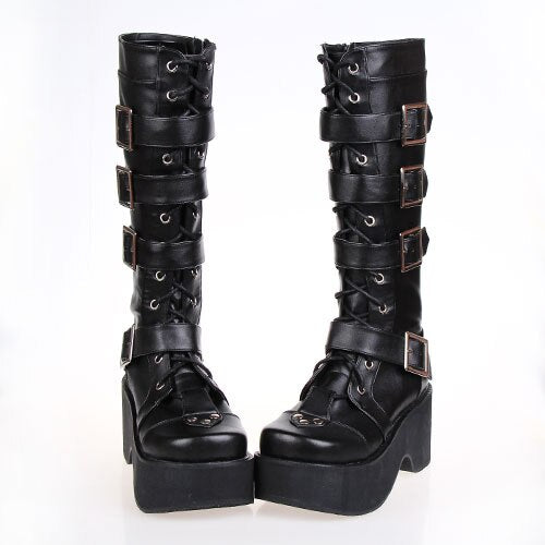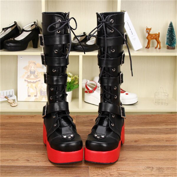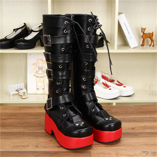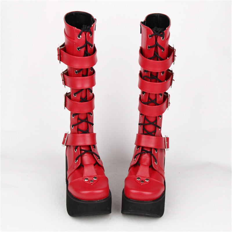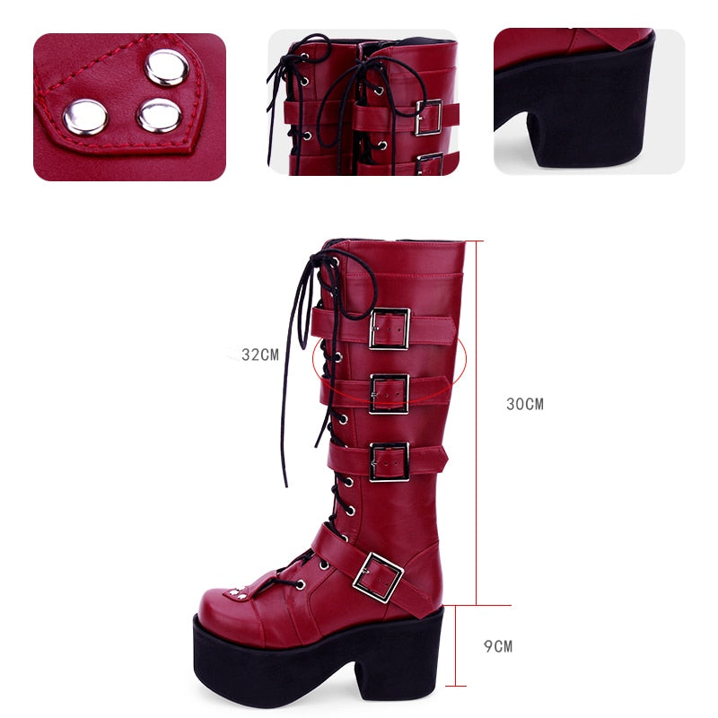 Japanese Harajuku Thick Platform Punk Goth Cosplay Boots Women Burgundy Leather Buckle Straps Lace Up High Boots