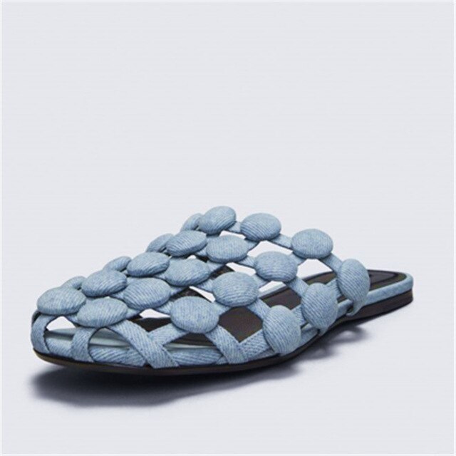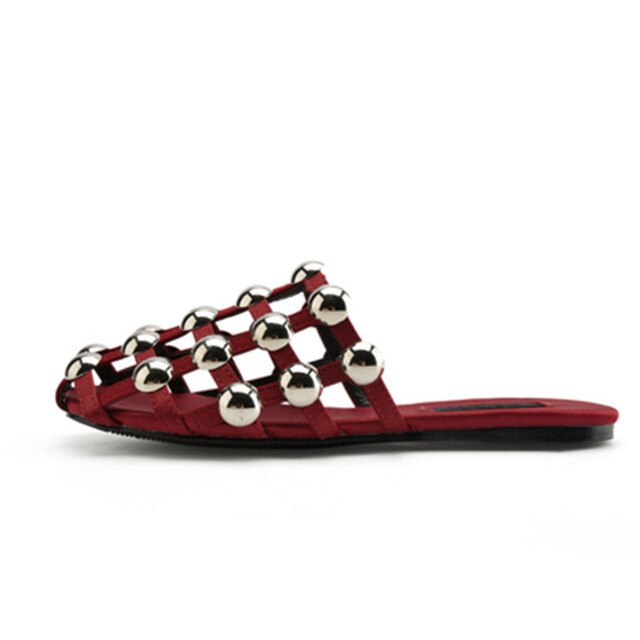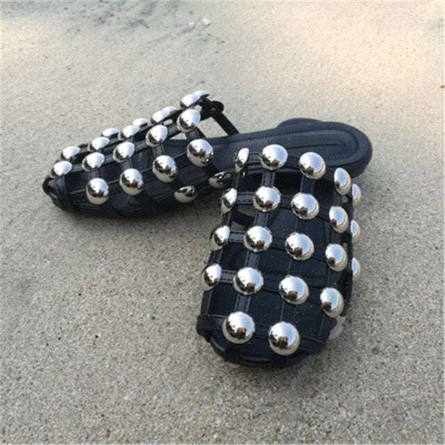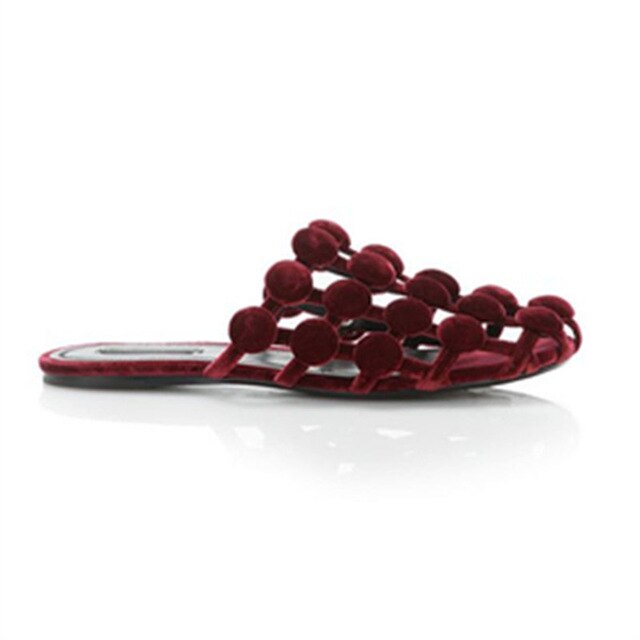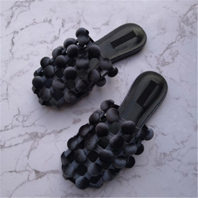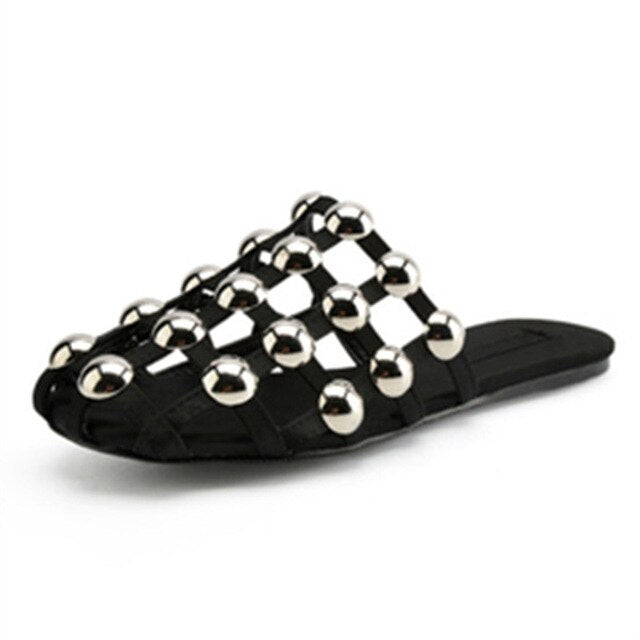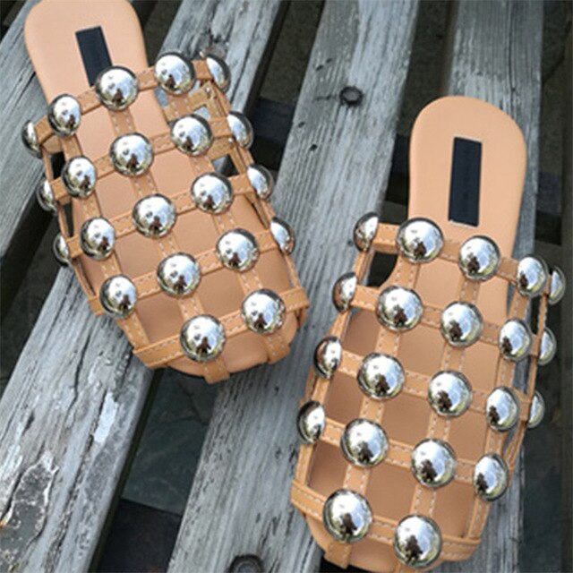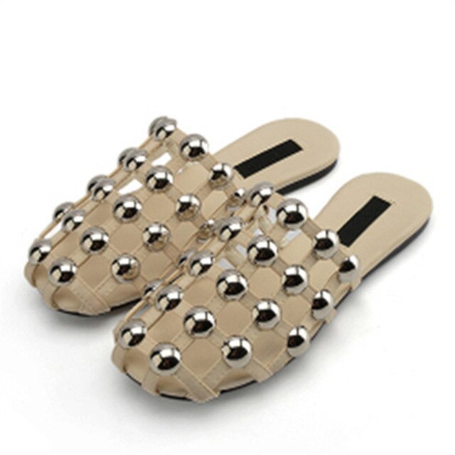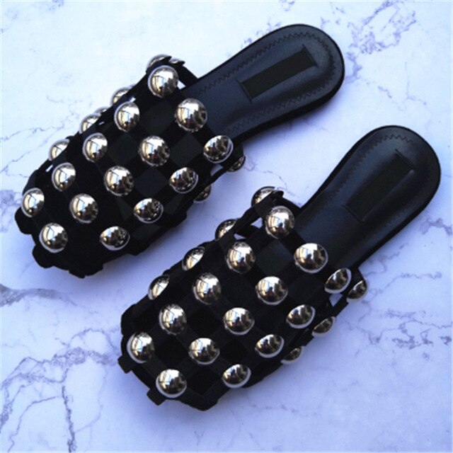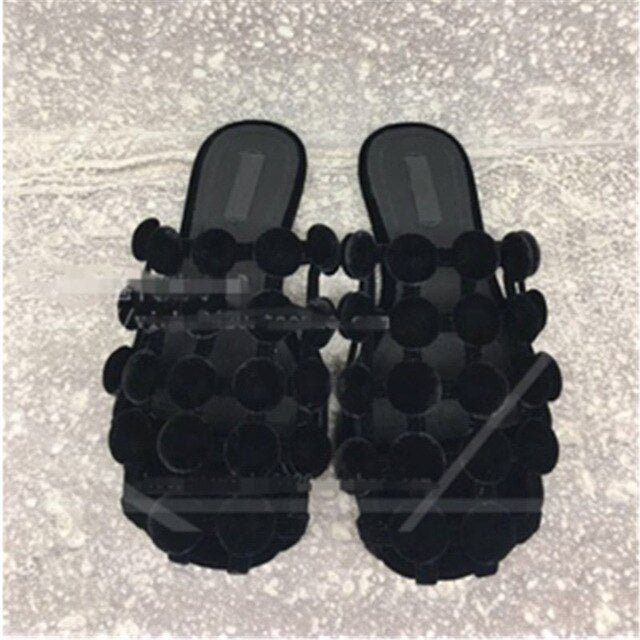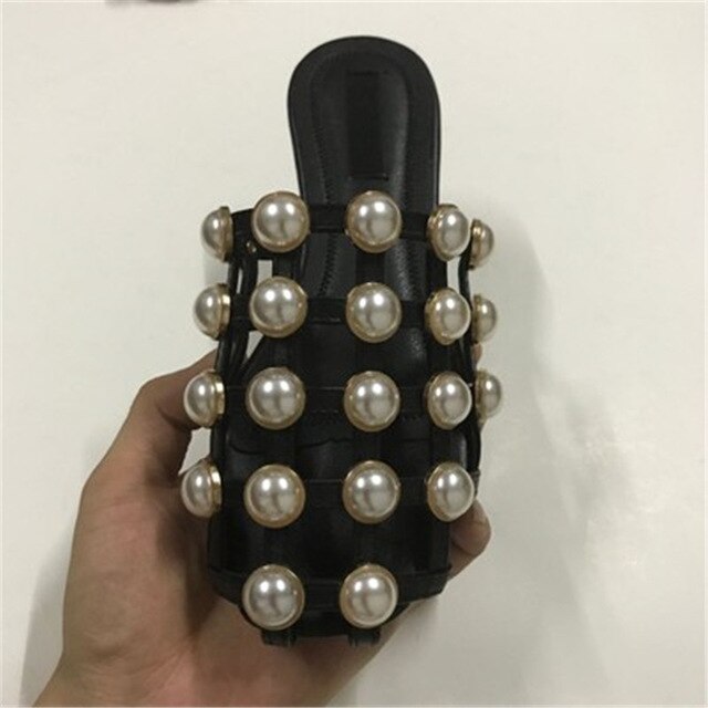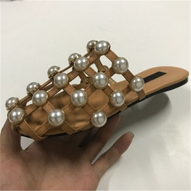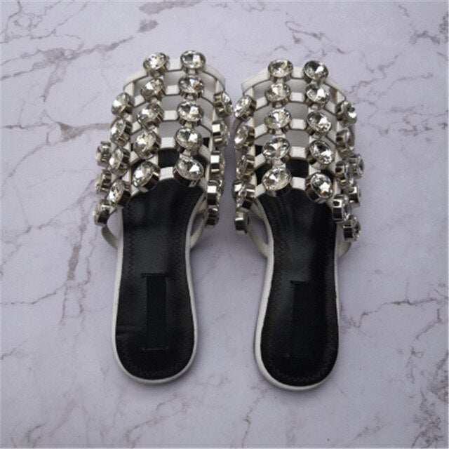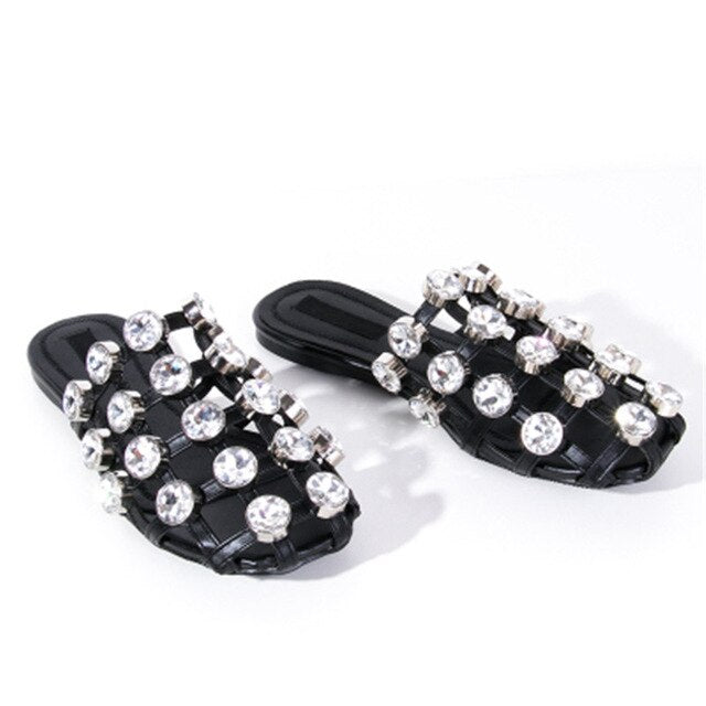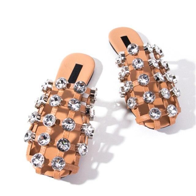 KF Amelia Mules Summer Shoes Woman Leather Slippers Hollow Crystal Slides Designer Beach Ladies Beading Sandals Zapatos De Mujer