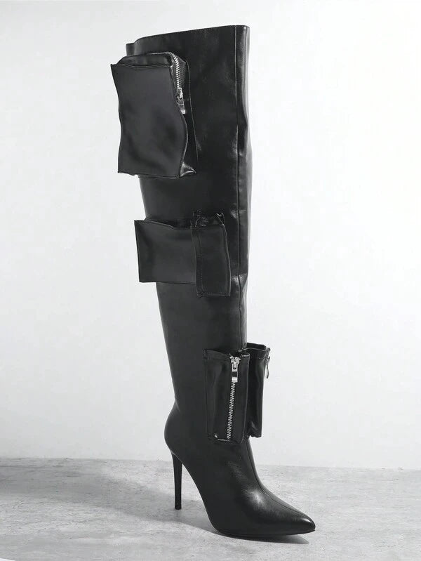 Knee-High Boots with Pocket Details and Stiletto Heel