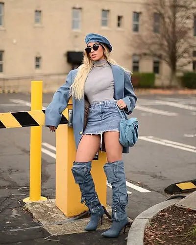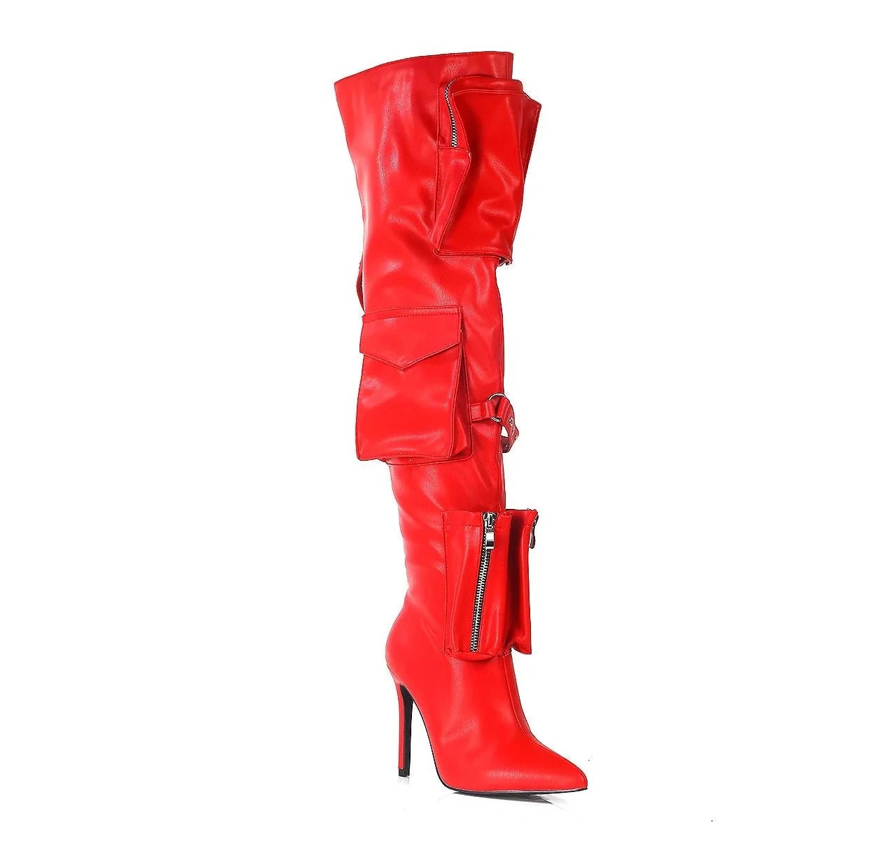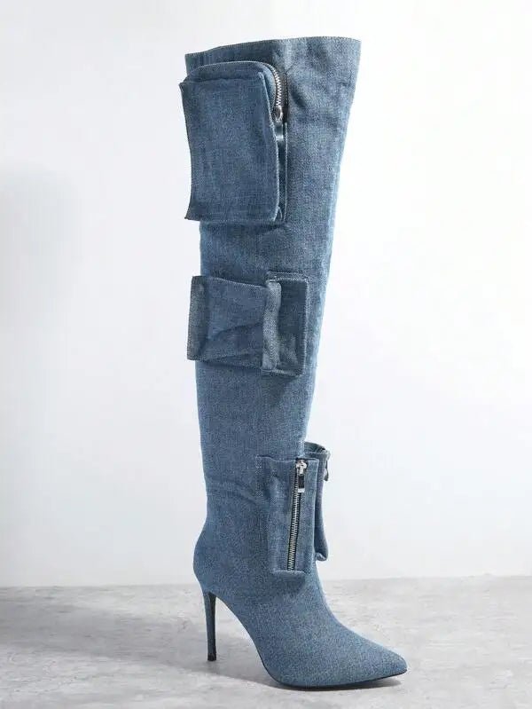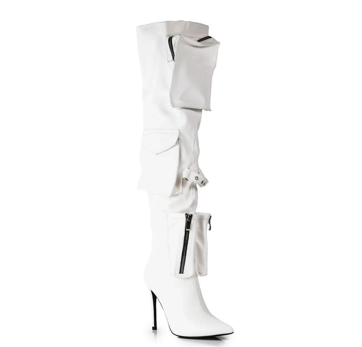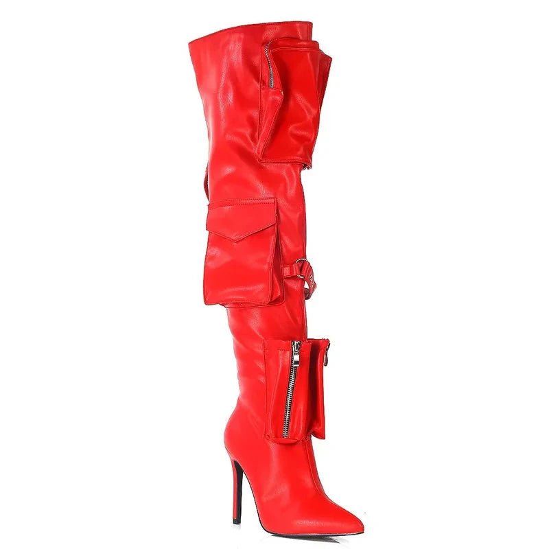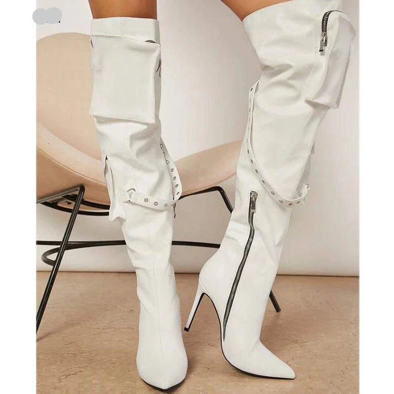 These knee-high boots blend unique design with bold, modern style. Featuring two large zippered flap pockets at the top and a small zippered pocket near the ankle, these boots add both functionality and edgy flair. A metal buckle accent between the upper pockets enhances the rugged look, while the sleek stiletto heel and pointed toe offer an elegant, feminine touch.