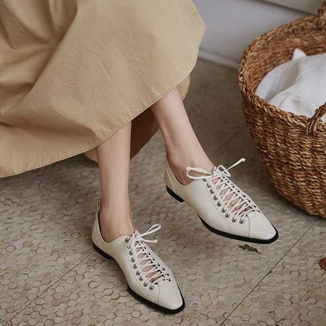 vintage design genuine leather casual shoes chic lace up small square toe low heels women solid fashion pumps