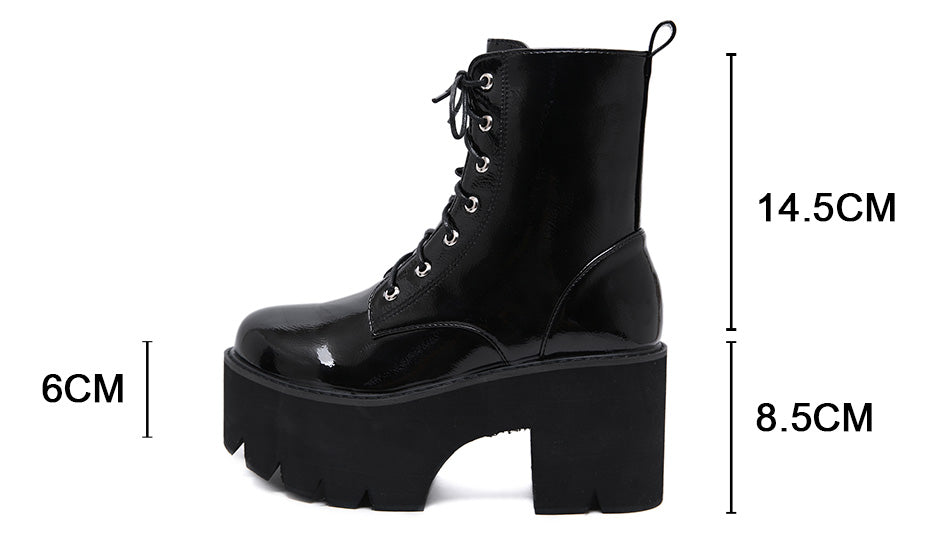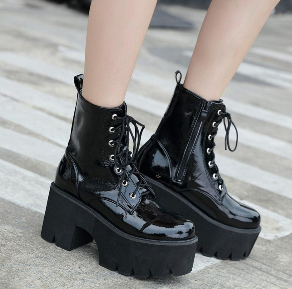 Ladies Chunky Wedge Platform Black Patent Leather Ankle Boots